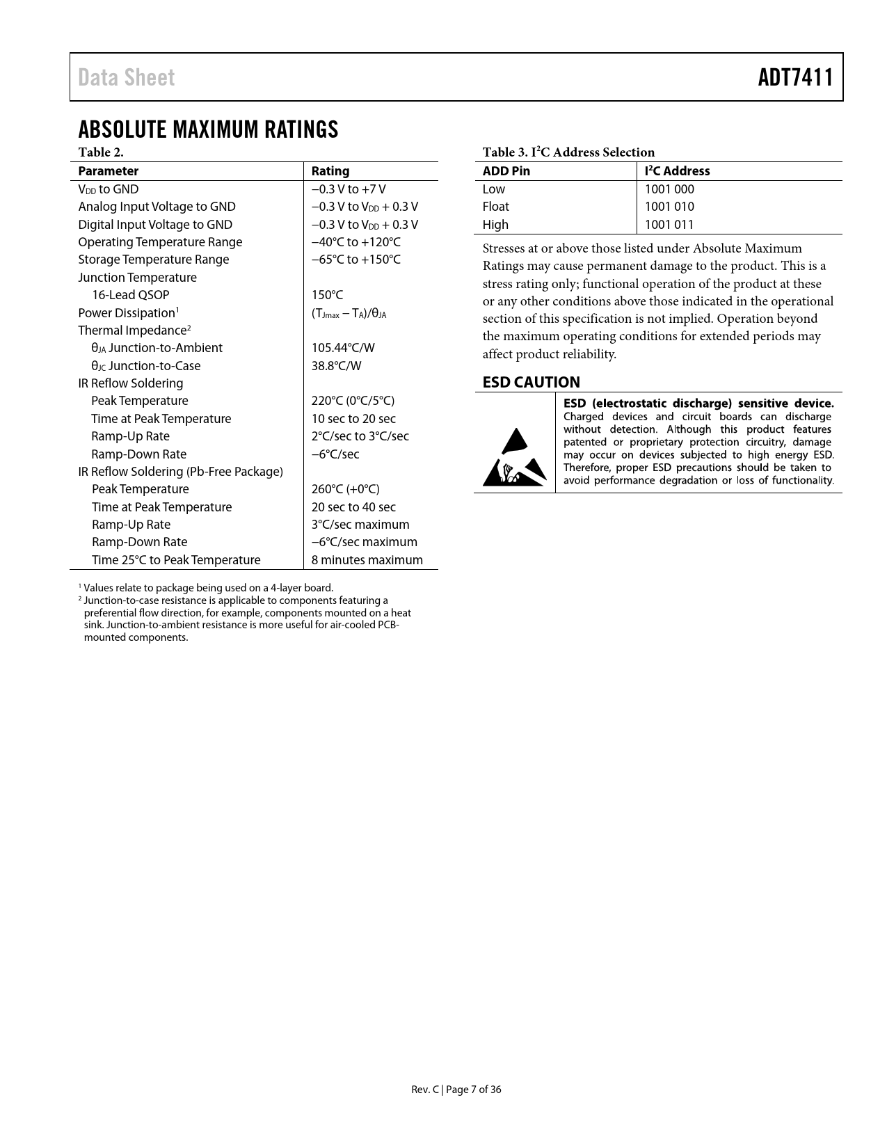 Data Sheet ADT7411 ABSOLUTE MAXIMUM RATINGS Table 2. Table 3. I2C Address Selection Parameter Rating ADD Pin I2C Address