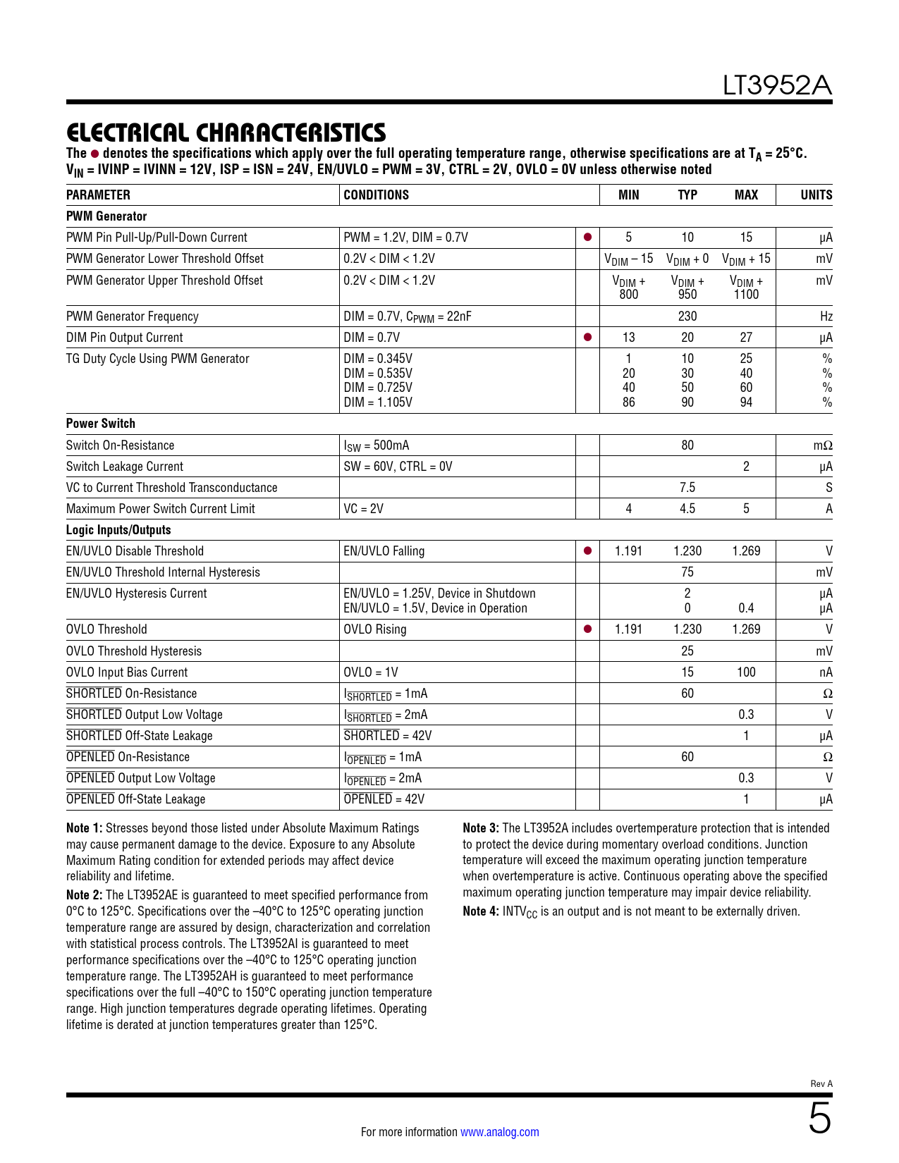 link to page 2 LT3952A ELECTRICAL CHARACTERISTICSThe l denotes the specifications which apply over the full operating temperature range, otherwise specifications are at TA = 25°C.VIN = IVINP = IVINN = 12V, ISP = ISN = 24V, EN/UVLO = PWM = 3V, CTRL = 2V, OVLO = 0V unless otherwise noted PARAMETERCONDITIONSMINTYPMAXUNITSPWM Generator PWM Pin Pull-Up/Pull-Down Current PWM = 1.2V, DIM = 0.7V l 5 10 15 µA PWM Generator Lower Threshold Offset 0.2V < DIM < 1.2V VDIM – 15 VDIM + 0 VDIM + 15 mV PWM Generator Upper Threshold Offset 0.2V < DIM < 1.2V VDIM + VDIM + VDIM + mV 800 950 1100 PWM Generator Frequency DIM = 0.7V, CPWM = 22nF 230 Hz DIM Pin Output Current DIM = 0.7V l 13 20 27 µA TG Duty Cycle Using PWM Generator DIM = 0.345V 1 10 25 % DIM = 0.535V 20 30 40 % DIM = 0.725V 40 50 60 % DIM = 1.105V 86 90 94 % Power Switch Switch On-Resistance ISW = 500mA 80 mΩ Switch Leakage Current SW = 60V, CTRL = 0V 2 µA VC to Current Threshold Transconductance 7.5 S Maximum Power Switch Current Limit VC = 2V 4 4.5 5 A Logic Inputs/Outputs EN/UVLO Disable Threshold EN/UVLO Falling l 1.191 1.230 1.269 V EN/UVLO Threshold Internal Hysteresis 75 mV EN/UVLO Hysteresis Current EN/UVLO = 1.25V, Device in Shutdown 2 µA EN/UVLO = 1.5V, Device in Operation 0 0.4 µA OVLO Threshold OVLO Rising l 1.191 1.230 1.269 V OVLO Threshold Hysteresis 25 mV OVLO Input Bias Current OVLO = 1V 15 100 nA SHORTLED On-Resistance ISHORTLED = 1mA 60 Ω SHORTLED Output Low Voltage ISHORTLED = 2mA 0.3 V SHORTLED Off-State Leakage SHORTLED = 42V 1 µA OPENLED On-Resistance IOPENLED = 1mA 60 Ω OPENLED Output Low Voltage IOPENLED = 2mA 0.3 V OPENLED Off-State Leakage OPENLED = 42V 1 µA Note 1: Stresses beyond those listed under Absolute Maximum Ratings Note 3: The LT3952A includes overtemperature protection that is intended may cause permanent damage to the device. Exposure to any Absolute to protect the device during momentary overload conditions. Junction Maximum Rating condition for extended periods may affect device temperature will exceed the maximum operating junction temperature reliability and lifetime. when overtemperature is active. Continuous operating above the specified Note 2: The LT3952AE is guaranteed to meet specified performance from maximum operating junction temperature may impair device reliability. 0°C to 125°C. Specifications over the –40°C to 125°C operating junction Note 4: INTVCC is an output and is not meant to be externally driven. temperature range are assured by design, characterization and correlation with statistical process controls. The LT3952AI is guaranteed to meet performance specifications over the –40°C to 125°C operating junction temperature range. The LT3952AH is guaranteed to meet performance specifications over the full –40°C to 150°C operating junction temperature range. High junction temperatures degrade operating lifetimes. Operating lifetime is derated at junction temperatures greater than 125°C. Rev A For more information www.analog.com 5 Document Outline Features Applications Typical Application Description Absolute Maximum Ratings Order Information Pin Configuration Electrical Characteristics Typical Performance Characteristics Pin Functions Block Diagram Operation Package Description Revision History Typical Application Related Parts