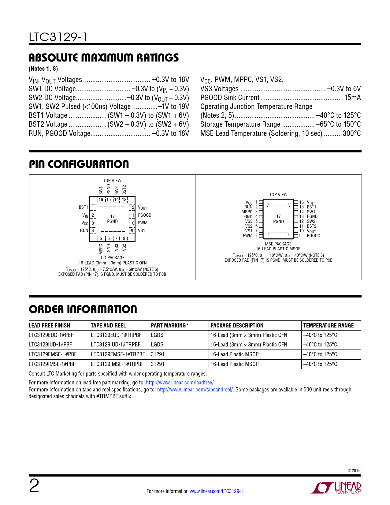 LTC3129-1 absoluTe MaxiMuM raTings(Notes 1, 8) VIN, VOUT Voltages ... –0.3V to 18V VCC, PWM, MPPC, VS1, VS2, SW1 DC Voltage .. –0.3V to (VIN + 0.3V) VS3 Voltages ... –0.3V to 6V SW2 DC Voltage..–0.3V to (VOUT + 0.3V) PGOOD Sink Current ..15mA SW1, SW2 Pulsed (<100ns) Voltage ..–1V to 19V Operating Junction Temperature Range BST1 Voltage ...(SW1 – 0.3V) to (SW1 + 6V) (Notes 2, 5) .. –40°C to 125°C BST2 Voltage ...(SW2 – 0.3V) to (SW2 + 6V) Storage Temperature Range .. –65°C to 150°C RUN, PGOOD Voltage ... –0.3V to 18V MSE Lead Temperature (Soldering, 10 sec) ..300°C pin conFiguraTion TOP VIEW SW1 PGND SW2 BST2 TOP VIEW 16 15 14 13 V 1 CC 16 VIN BST1 1 12 VOUT RUN 2 15 BST1 MPPC 3 14 SW1 VIN 2 11 PGOOD 17 GND 4 17 13 PGND V VS3 5 PGND 12 SW2 CC 3 PGND 10 PWM VS2 6 11 BST2 RUN 4 9 VS1 VS1 7 10 VOUT PWM 8 9 PGOOD 5 6 7 8 MSE PACKAGE 16-LEAD PLASTIC MSOP MPPC GND VS3 VS2 UD PACKAGE TJMAX = 125°C, θJC = 10°C/W, θJA = 40°C/W (NOTE 6) 16-LEAD (3mm × 3mm) PLASTIC QFN EXPOSED PAD (PIN 17) IS PGND, MUST BE SOLDERED TO PCB TJMAX = 125°C, θJC = 7.5°C/W, θJA = 68°C/W (NOTE 6) EXPOSED PAD (PIN 17) IS PGND, MUST BE SOLDERED TO PCB orDer inForMaTion LEAD FREE FINISHTAPE AND REELPART MARKING*PACKAGE DESCRIPTIONTEMPERATURE RANGE LTC3129EUD-1#PBF LTC3129EUD-1#TRPBF LGDS 16-Lead (3mm × 3mm) Plastic QFN –40°C to 125°C LTC3129IUD-1#PBF LTC3129IUD-1#TRPBF LGDS 16-Lead (3mm × 3mm) Plastic QFN –40°C to 125°C LTC3129EMSE-1#PBF LTC3129EMSE-1#TRPBF 31291 16-Lead Plastic MSOP –40°C to 125°C LTC3129IMSE-1#PBF LTC3129IMSE-1#TRPBF 31291 16-Lead Plastic MSOP –40°C to 125°C Consult LTC Marketing for parts specified with wider operating temperature ranges. For more information on lead free part marking, go to: http://www.linear.com/leadfree/ For more information on tape and reel specifications, go to: http://www.linear.com/tapeandreel/. Some packages are available in 500 unit reels through designated sales channels with #TRMPBF suffix. 31291fc 2 For more information www.linear.com/LTC3129-1