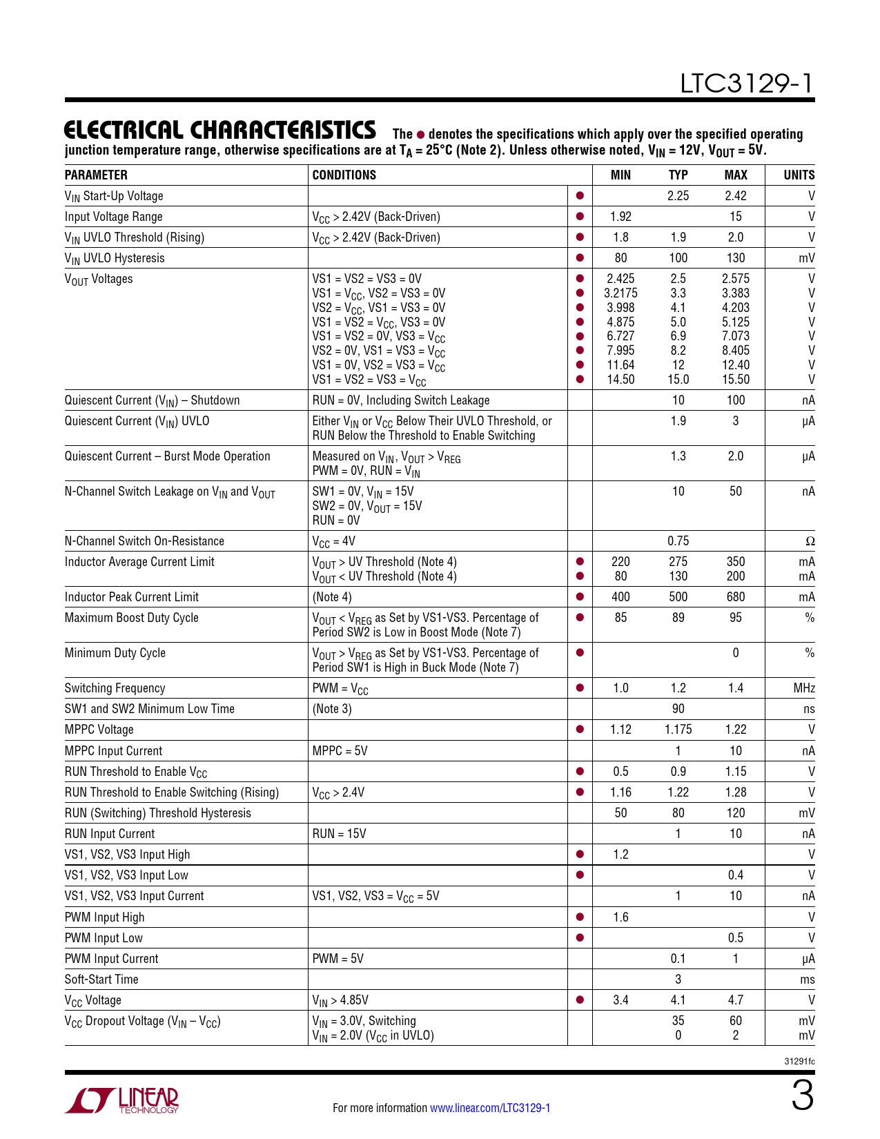 LTC3129-1 e lecTrical characTerisTics The l denotes the specifications which apply over the specified operatingjunction temperature range, otherwise specifications are at TA = 25°C (Note 2). Unless otherwise noted, VIN = 12V, VOUT = 5V. PARAMETERCONDITIONSMINTYPMAXUNITS VIN Start-Up Voltage l 2.25 2.42 V Input Voltage Range VCC > 2.42V (Back-Driven) l 1.92 15 V VIN UVLO Threshold (Rising) VCC > 2.42V (Back-Driven) l 1.8 1.9 2.0 V VIN UVLO Hysteresis l 80 100 130 mV VOUT Voltages VS1 = VS2 = VS3 = 0V l 2.425 2.5 2.575 V VS1 = VCC, VS2 = VS3 = 0V l 3.2175 3.3 3.383 V VS2 = VCC, VS1 = VS3 = 0V l 3.998 4.1 4.203 V VS1 = VS2 = VCC, VS3 = 0V l 4.875 5.0 5.125 V VS1 = VS2 = 0V, VS3 = VCC l 6.727 6.9 7.073 V VS2 = 0V, VS1 = VS3 = VCC l 7.995 8.2 8.405 V VS1 = 0V, VS2 = VS3 = VCC l 11.64 12 12.40 V VS1 = VS2 = VS3 = VCC l 14.50 15.0 15.50 V Quiescent Current (VIN) – Shutdown RUN = 0V, Including Switch Leakage 10 100 nA Quiescent Current (VIN) UVLO Either VIN or VCC Below Their UVLO Threshold, or 1.9 3 µA RUN Below the Threshold to Enable Switching Quiescent Current – Burst Mode Operation Measured on VIN, VOUT > VREG 1.3 2.0 µA PWM = 0V, RUN = VIN N-Channel Switch Leakage on VIN and VOUT SW1 = 0V, VIN = 15V 10 50 nA SW2 = 0V, VOUT = 15V RUN = 0V N-Channel Switch On-Resistance VCC = 4V 0.75 Ω Inductor Average Current Limit VOUT > UV Threshold (Note 4) l 220 275 350 mA VOUT < UV Threshold (Note 4) l 80 130 200 mA Inductor Peak Current Limit (Note 4) l 400 500 680 mA Maximum Boost Duty Cycle VOUT < VREG as Set by VS1-VS3. Percentage of l 85 89 95 % Period SW2 is Low in Boost Mode (Note 7) Minimum Duty Cycle VOUT > VREG as Set by VS1-VS3. Percentage of l 0 % Period SW1 is High in Buck Mode (Note 7) Switching Frequency PWM = VCC l 1.0 1.2 1.4 MHz SW1 and SW2 Minimum Low Time (Note 3) 90 ns MPPC Voltage l 1.12 1.175 1.22 V MPPC Input Current MPPC = 5V 1 10 nA RUN Threshold to Enable VCC l 0.5 0.9 1.15 V RUN Threshold to Enable Switching (Rising) VCC > 2.4V l 1.16 1.22 1.28 V RUN (Switching) Threshold Hysteresis 50 80 120 mV RUN Input Current RUN = 15V 1 10 nA VS1, VS2, VS3 Input High l 1.2 V VS1, VS2, VS3 Input Low l 0.4 V VS1, VS2, VS3 Input Current VS1, VS2, VS3 = VCC = 5V 1 10 nA PWM Input High l 1.6 V PWM Input Low l 0.5 V PWM Input Current PWM = 5V 0.1 1 µA Soft-Start Time 3 ms VCC Voltage VIN > 4.85V l 3.4 4.1 4.7 V VCC Dropout Voltage (VIN – VCC) VIN = 3.0V, Switching 35 60 mV VIN = 2.0V (VCC in UVLO) 0 2 mV 31291fc For more information www.linear.com/LTC3129-1 3