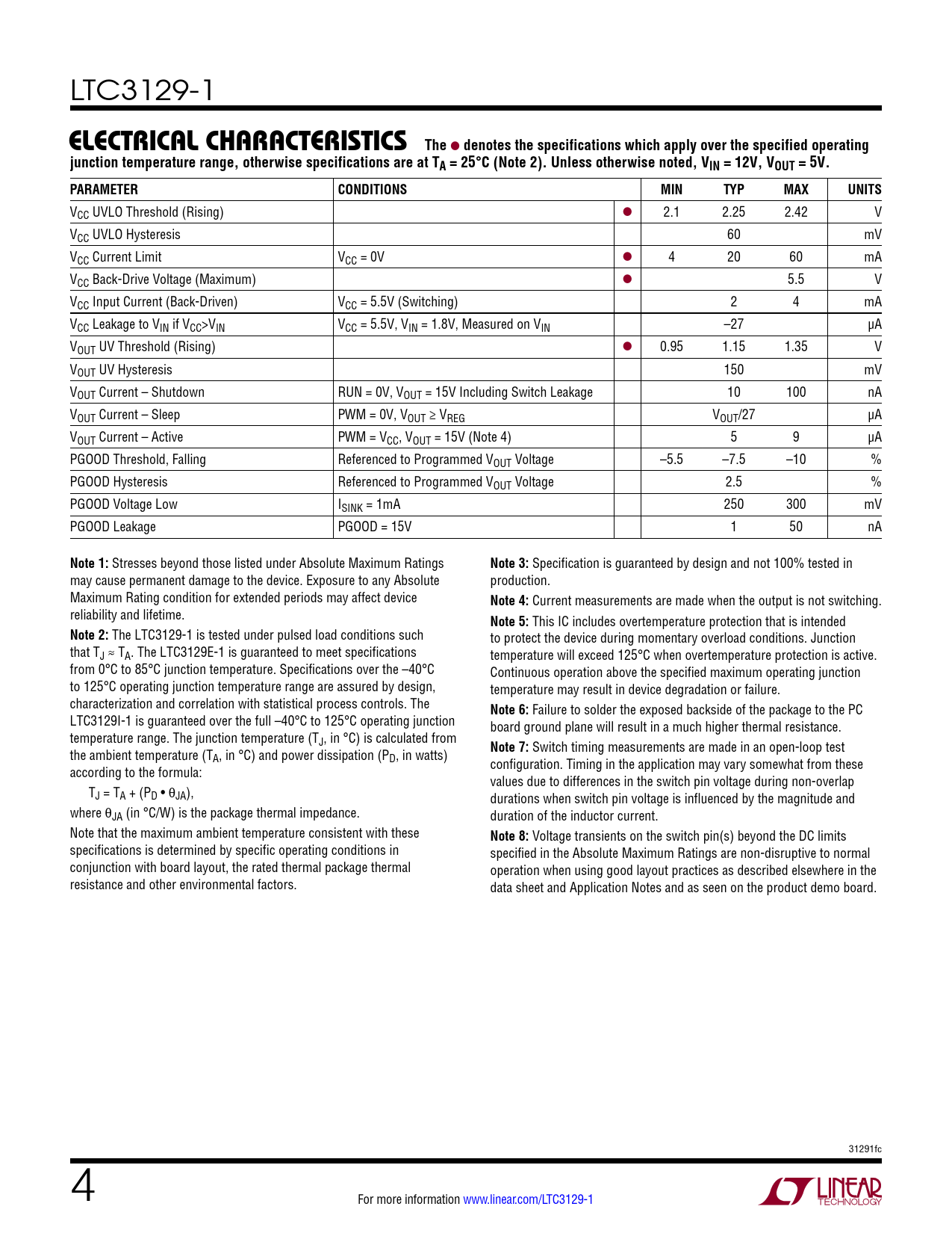 LTC3129-1 e lecTrical characTerisTics The l denotes the specifications which apply over the specified operatingjunction temperature range, otherwise specifications are at TA = 25°C (Note 2). Unless otherwise noted, VIN = 12V, VOUT = 5V. PARAMETERCONDITIONSMINTYPMAXUNITS VCC UVLO Threshold (Rising) l 2.1 2.25 2.42 V VCC UVLO Hysteresis 60 mV VCC Current Limit VCC = 0V l 4 20 60 mA VCC Back-Drive Voltage (Maximum) l 5.5 V VCC Input Current (Back-Driven) VCC = 5.5V (Switching) 2 4 mA VCC Leakage to VIN if VCC>VIN VCC = 5.5V, VIN = 1.8V, Measured on VIN –27 µA VOUT UV Threshold (Rising) l 0.95 1.15 1.35 V VOUT UV Hysteresis 150 mV VOUT Current – Shutdown RUN = 0V, VOUT = 15V Including Switch Leakage 10 100 nA VOUT Current – Sleep PWM = 0V, VOUT ≥ VREG VOUT/27 µA VOUT Current – Active PWM = VCC, VOUT = 15V (Note 4) 5 9 µA PGOOD Threshold, Falling Referenced to Programmed VOUT Voltage –5.5 –7.5 –10 % PGOOD Hysteresis Referenced to Programmed VOUT Voltage 2.5 % PGOOD Voltage Low ISINK = 1mA 250 300 mV PGOOD Leakage PGOOD = 15V 1 50 nA Note 1: Stresses beyond those listed under Absolute Maximum Ratings Note 3: Specification is guaranteed by design and not 100% tested in may cause permanent damage to the device. Exposure to any Absolute production. Maximum Rating condition for extended periods may affect device Note 4: Current measurements are made when the output is not switching. reliability and lifetime. Note 5: This IC includes overtemperature protection that is intended Note 2: The LTC3129-1 is tested under pulsed load conditions such to protect the device during momentary overload conditions. Junction that TJ ≈ TA. The LTC3129E-1 is guaranteed to meet specifications temperature will exceed 125°C when overtemperature protection is active. from 0°C to 85°C junction temperature. Specifications over the –40°C Continuous operation above the specified maximum operating junction to 125°C operating junction temperature range are assured by design, temperature may result in device degradation or failure. characterization and correlation with statistical process controls. The Note 6: Failure to solder the exposed backside of the package to the PC LTC3129I-1 is guaranteed over the full –40°C to 125°C operating junction board ground plane will result in a much higher thermal resistance. temperature range. The junction temperature (TJ, in °C) is calculated from the ambient temperature (T Note 7: Switch timing measurements are made in an open-loop test A, in °C) and power dissipation (PD, in watts) according to the formula: configuration. Timing in the application may vary somewhat from these values due to differences in the switch pin voltage during non-overlap TJ = TA + (PD • θJA), durations when switch pin voltage is influenced by the magnitude and where θJA (in °C/W) is the package thermal impedance. duration of the inductor current. Note that the maximum ambient temperature consistent with these Note 8: Voltage transients on the switch pin(s) beyond the DC limits specifications is determined by specific operating conditions in specified in the Absolute Maximum Ratings are non-disruptive to normal conjunction with board layout, the rated thermal package thermal operation when using good layout practices as described elsewhere in the resistance and other environmental factors. data sheet and Application Notes and as seen on the product demo board. 31291fc 4 For more information www.linear.com/LTC3129-1
