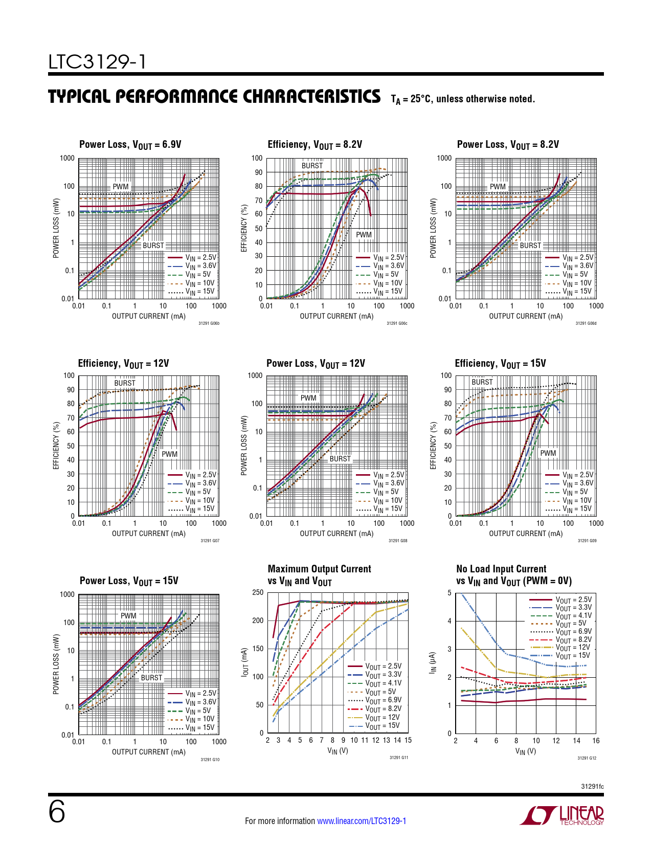 1000 100 1000 BURST 90 100 PWM 80 100 PWM 70 10 60 10 50 PWM 1 BURST 40 1 EFFICIENCY (%) BURST POWER LOSS (mW) VIN = 2.5V 30 VIN = 2.5V POWER LOSS (mW) VIN = 2.5V V V V 0.1 IN = 3.6V IN = 3.6V IN = 3.6V V 20 0.1 IN = 5V VIN = 5V VIN = 5V VIN = 10V 10 VIN = 10V VIN = 10V VIN = 15V VIN = 15V VIN = 15V 0.01 0 0.01 0.01 0.1 1 10 100 1000 0.01 0.1 1 10 100 1000 0.01 0.1 1 10 100 1000 OUTPUT CURRENT (mA) OUTPUT CURRENT (mA) OUTPUT CURRENT (mA) 31291 G06b 31291 G06c 31291 G06d