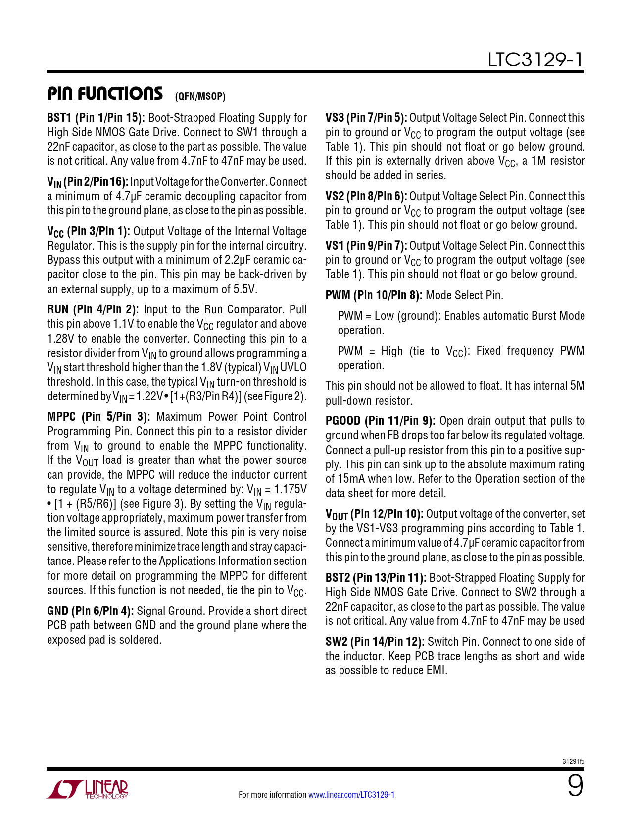 Switch Pin. Connect to one side of the inductor. Keep PCB trace lengths as short and wide as possible to reduce EMI. 31291fc For more information www.linear.com/LTC3129-1 9