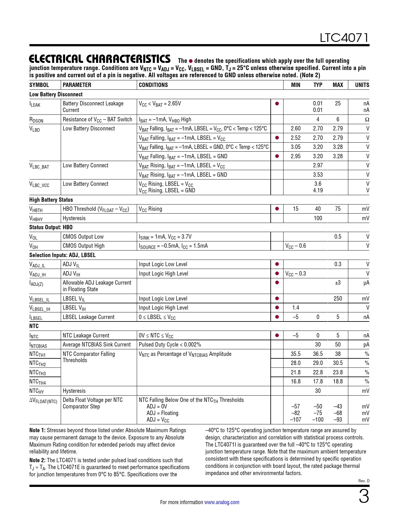 denotes the specifications which apply over the full operating junction temperature range. Conditions are VNTC = VADJ = VCC, VLBSEL = GND, TJ = 25°C unless otherwise specified. Current into a pin is positive and current out of a pin is negative. All voltages are referenced to GND unless otherwise noted. (Note 2) SYMBOL PARAMETER CONDITIONS MIN TYP MAX UNITS Low Battery Disconnect