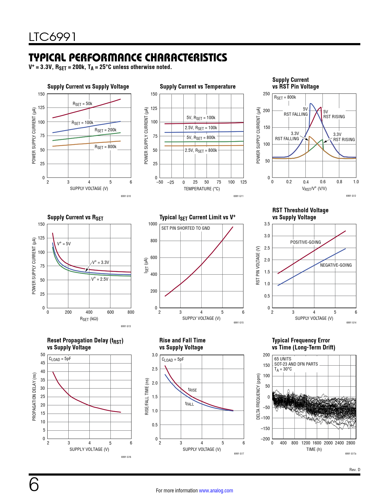 150 1000 3.5 SET PIN SHORTED TO GND 125 3.0 800 V+ = 5V POSITIVE-GOING 2.5 100 600 V+ = 3.3V TAGE (V) 2.0 Y CURRENT (µA) 75 (µA) NEGATIVE-GOING I SET 400 1.5 50 V+ = 2.5V RST PIN VOL 1.0 POWER SUPPL 200 25 0.5 0 0 0 0 200 400 600 800 2 3 4 5 6 2 3 4 5 6 RSET (kΩ) SUPPLY VOLTAGE (V) SUPPLY VOLTAGE (V) 6991 G15 6991 G14 6991 G13