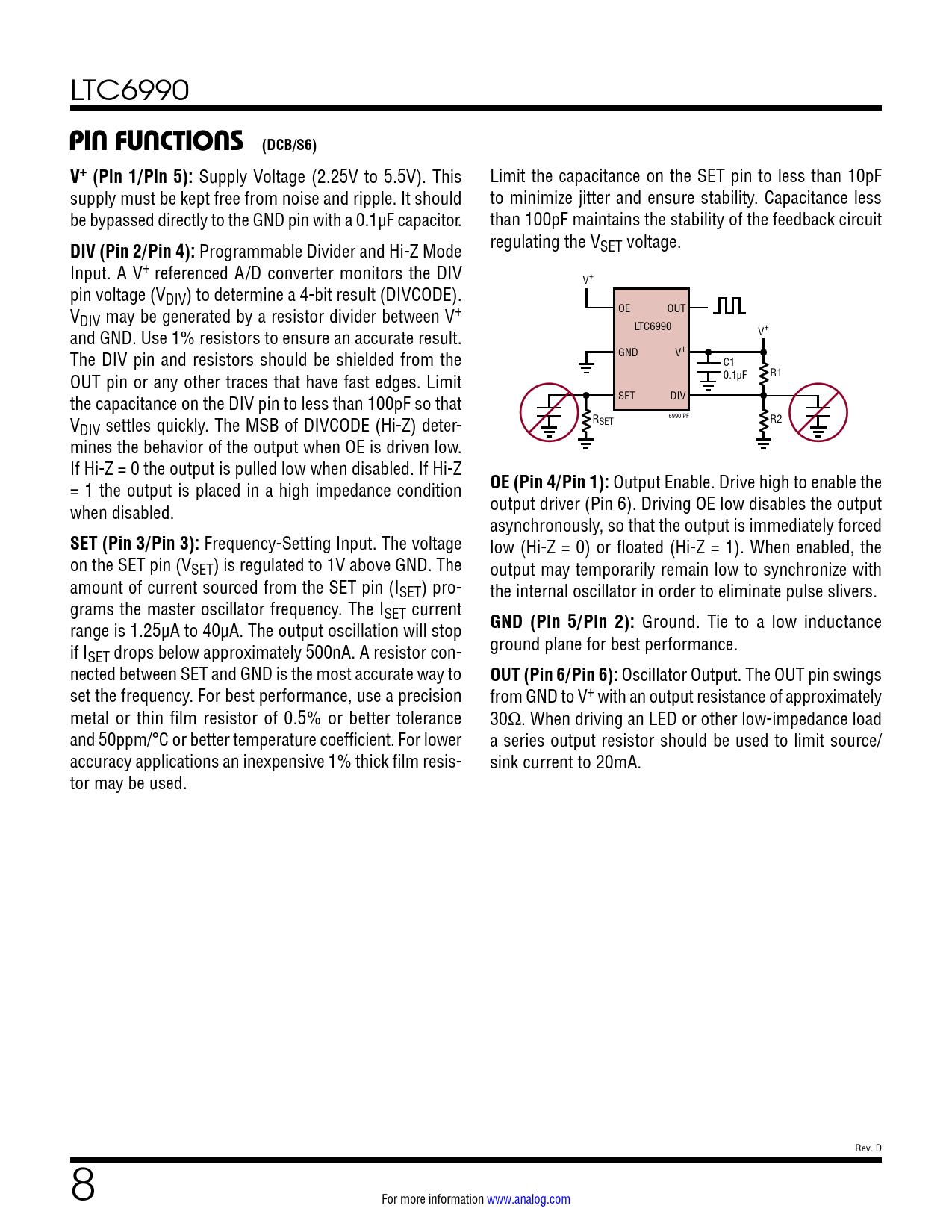 PIN FUNCTIONS (DCB/S6). V+ (Pin 1/Pin 5):. DIV (Pin 2/Pin 4):. OE (Pin 4/Pin 1):. SET (Pin 3/Pin 3):. GND (Pin 5/Pin 2):
