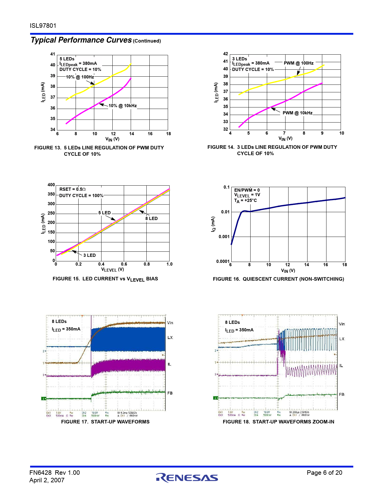 Typical Performance Curves (Continued) 41 42 5 LEDs 3 LEDs 41 40 ILEDpeak = 380mA ILEDpeak = 380mA PWM @ 100Hz DUTY CYCLE = 10% 40 DUTY CYCLE = 10% 39 10% @ 100Hz 39 38 38 (mA) (mA) 37 D 37 I LE 36 I LED 36 10% @ 10kHz 35 34 PWM @ 10kHz 35 33 34 32 6 8 10 12 14 16 18 4 5 6 7 8 9 10 VIN (V) VIN (V) FIGURE 13. 5 LEDs LINE REGULATION OF PWM DUTY FIGURE 14. 3 LEDs LINE REGULATION OF PWM DUTY CYCLE OF 10% CYCLE OF 10% 400 RSET = 0.5 0.1 EN/PWM = 0 350 DUTY CYCLE = 100% VLEVEL = 1V T 300 A = +25°C ) 250 5 LED 0.01 A ) m 8 LED A ( 200 (m I LED 150 I Q 0.001 100 50 3 LED 0 0.0001 0 0.2 0.4 0.6 0.8 1.0 6 8 10 12 14 16 18 VLEVEL (V) VIN (V) FIGURE 15. LED CURRENT vs VLEVEL BIAS FIGURE 16. QUIESCENT CURRENT (NON-SWITCHING) 8 LEDs 8 LEDs ILED = 350mA ILED = 350mA FIGURE 17. START-UP WAVEFORMS FIGURE 18. START-UP WAVEFORMS ZOOM-IN