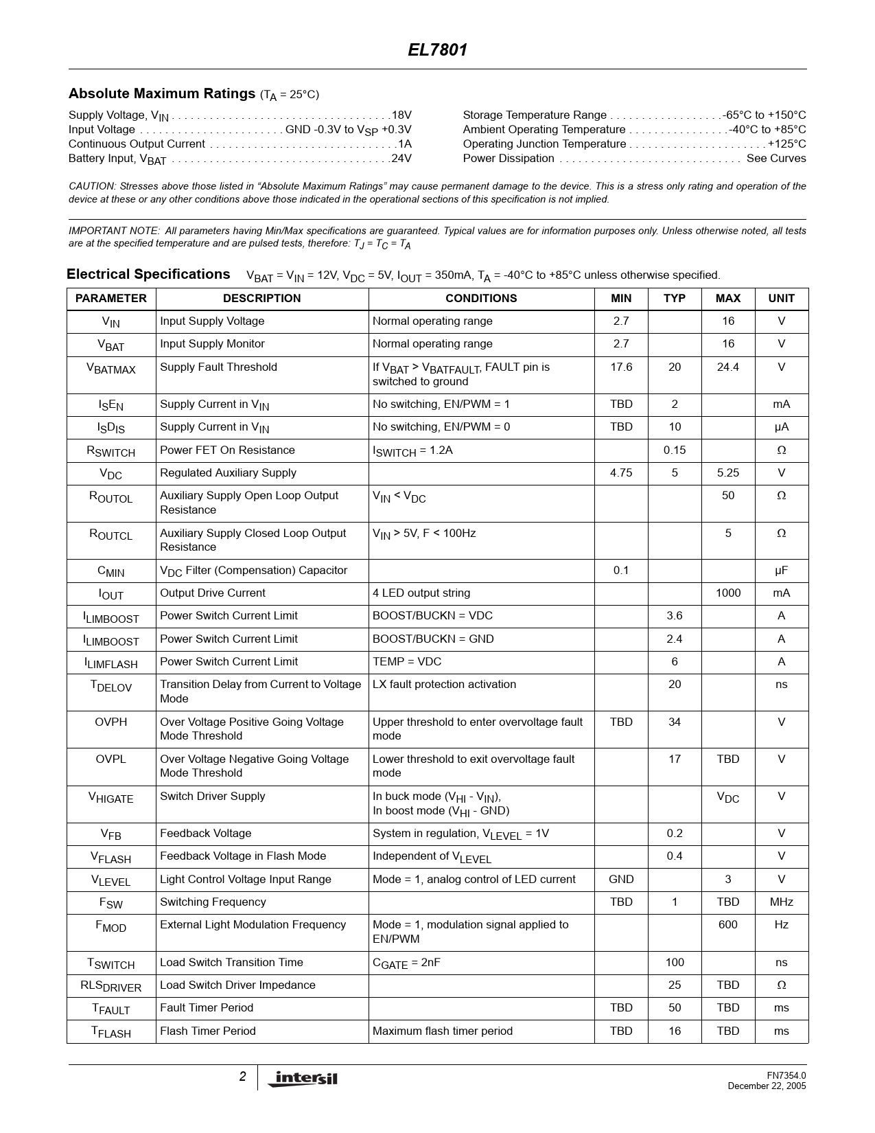 EL7801 Absolute Maximum Ratings Electrical Specifications PARAMETER DESCRIPTION CONDITIONS MIN TYP MAX UNIT