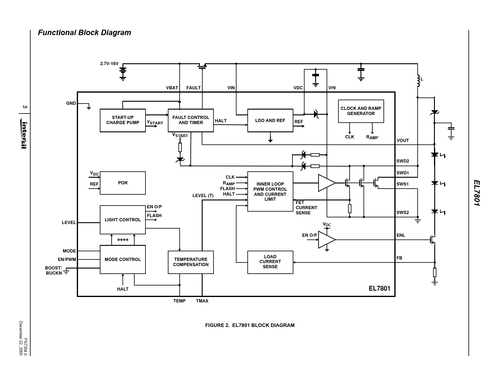 GND CLOCK AND RAMP GENERATOR START-UP FAULT CONTROL CHARGE PUMP V HALT START AND TIMER LDO AND REF REF VSTART CLK RAMP VOUT SWD2 VDC SWD1 CLK EL7801 POR REF RAMP INNER LOOP SWS1 FLASH PWM CONTROL HALT AND CURRENT LEVEL (T) LIMIT FET EN O/P CURRENT SENSE SWS2 FLASH LIGHT CONTROL LEVEL VDC EN O/P ENL MODE LOAD EN/PWM MODE CONTROL TEMPERATURE FB CURRENT COMPENSATION SENSE BOOST/ BUCKN HALT EL7801 TEMP TMAX
