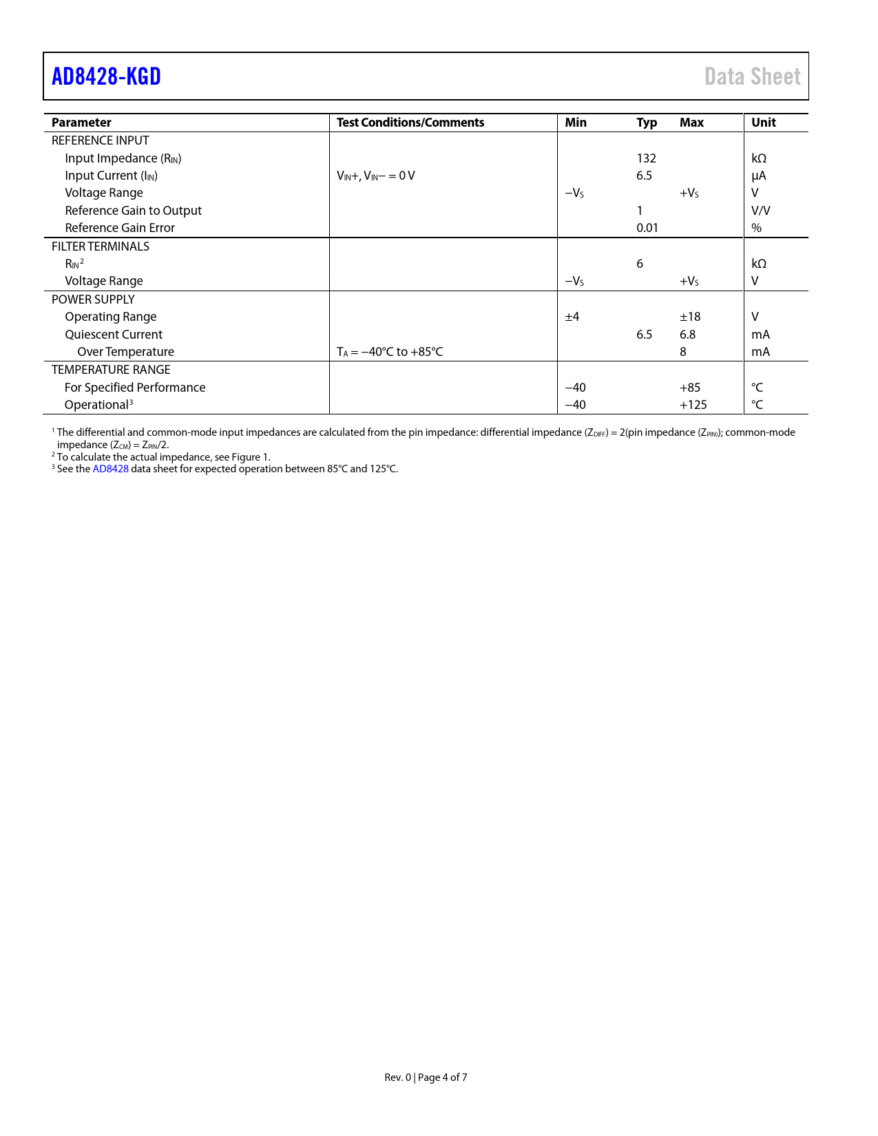 Seiten / Seite7 / 4 — AD8428-KGD. Data Sheet. Parameter. Test Conditions/Comments. Min. Typ. …
