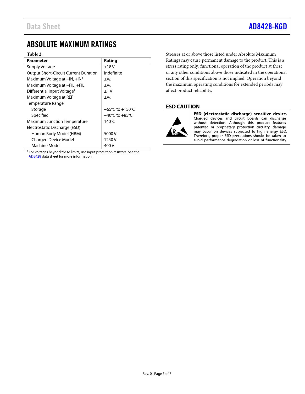 Data Sheet AD8428-KGD ABSOLUTE MAXIMUM RATINGS Table 2 Parameter Rating ESD CAUTION