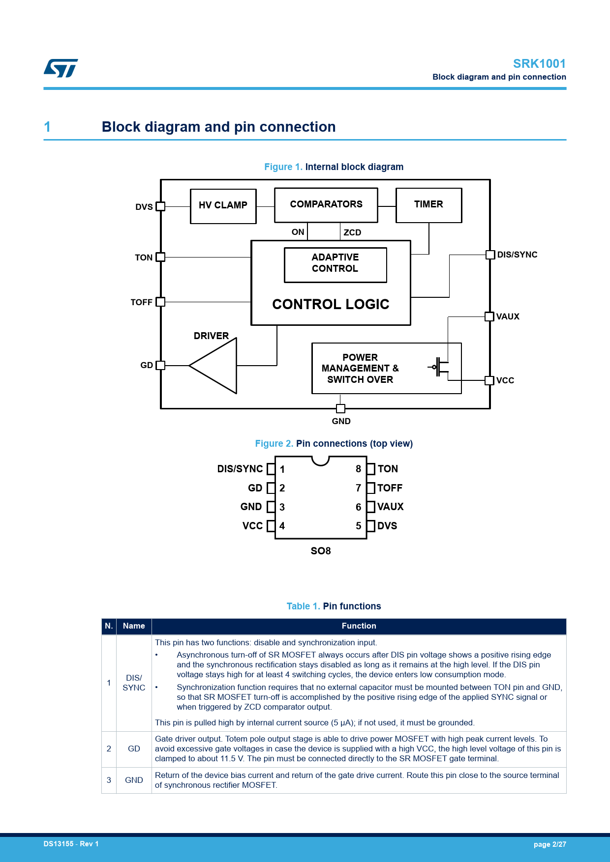 SRK1001 Block diagram and pin connection Figure 1 Internal block diagram DVS HV CLAMP COMPARATORS TIMER ZCD TON ADAPTIVE
