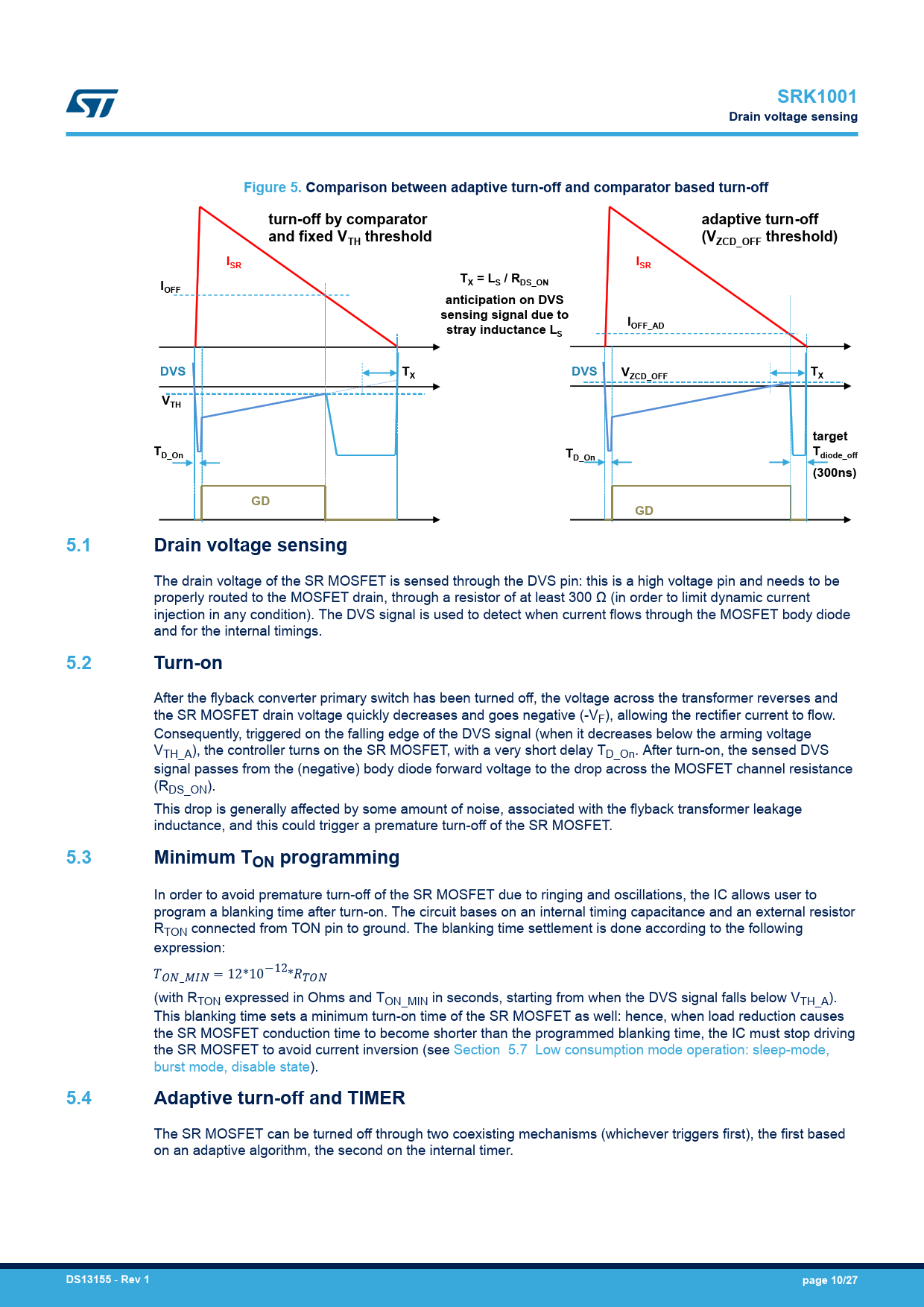 link to page 14 link to page 14 SRK1001Drain voltage sensingFigure 5. Comparison between adaptive turn-off and comparator based turn-offturn-off by comparatoradaptive turn-offand fixed VTH threshold(VZCD_OFF threshold)ISRISRTX = LS / RDS_ONIOFFanticipation on DVSsensing signal due toIstray inductance LOFF_ADSDVSTXDVSVTZCD_OFFXVTHtargetTD_OnTTD_Ondiode_off(300ns)GDGD5.1Drain voltage sensing The drain voltage of the SR MOSFET is sensed through the DVS pin: this is a high voltage pin and needs to be properly routed to the MOSFET drain, through a resistor of at least 300 Ω (in order to limit dynamic current injection in any condition). The DVS signal is used to detect when current flows through the MOSFET body diode and for the internal timings. 5.2Turn-on After the flyback converter primary switch has been turned off, the voltage across the transformer reverses and the SR MOSFET drain voltage quickly decreases and goes negative (-VF), allowing the rectifier current to flow. Consequently, triggered on the falling edge of the DVS signal (when it decreases below the arming voltage VTH_A), the controller turns on the SR MOSFET, with a very short delay TD_On. After turn-on, the sensed DVS signal passes from the (negative) body diode forward voltage to the drop across the MOSFET channel resistance (RDS_ON). This drop is generally affected by some amount of noise, associated with the flyback transformer leakage inductance, and this could trigger a premature turn-off of the SR MOSFET. 5.3Minimum TON programming In order to avoid premature turn-off of the SR MOSFET due to ringing and oscillations, the IC allows user to program a blanking time after turn-on. The circuit bases on an internal timing capacitance and an external resistor RTON connected from TON pin to ground. The blanking time settlement is done according to the following expression: TON_MIN = 12*10−12*RTON (with RTON expressed in Ohms and TON_MIN in seconds, starting from when the DVS signal falls below VTH_A). This blanking time sets a minimum turn-on time of the SR MOSFET as well: hence, when load reduction causes the SR MOSFET conduction time to become shorter than the programmed blanking time, the IC must stop driving the SR MOSFET to avoid current inversion (see Section 5.7 Low consumption mode operation: sleep-mode, burst mode, disable state). 5.4Adaptive turn-off and TIMER The SR MOSFET can be turned off through two coexisting mechanisms (whichever triggers first), the first based on an adaptive algorithm, the second on the internal timer. DS13155 - Rev 1page 10/27 Document Outline 1 Block diagram and pin connection 2 Maximum ratings 3 Typical application schematic 4 Electrical characteristics 5 Operation description 5.1 Drain voltage sensing 5.2 Turn-on 5.3 Minimum TON programming 5.4 Adaptive turn-off and TIMER 5.4.1 Fixed frequency mixed DCM/CCM operation 5.4.2 QR operation (with valley skipping) 5.4.3 Fixed frequency DCM operation 5.4.4 Variable frequency CCM operation 5.5 Minimum TOFF programming 5.6 Start-up phase 5.7 Low consumption mode operation: sleep-mode, burst mode, disable state 5.8 DIS/SYNC pin functions 5.9 VAUX pin operation in CC regulation 5.9.1 Example for parameter calculations 5.10 Operation in CC regulation and short circuit 5.11 Adaptive gate drive 6 Layout guidelines 7 Package mechanical data Revision history