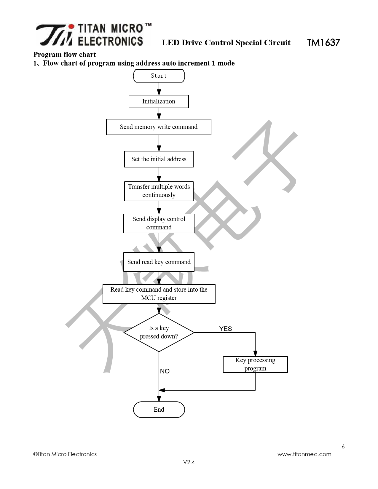 Start Initialization Send memory write command Set the initial address Transfer multiple words continuously Send display control command Send read key command Read key command and store into the MCU register Is a key YES pressed down? Key processing program NO End 6 ©Titan Micro Electronics www.titanmec.com V2.4
