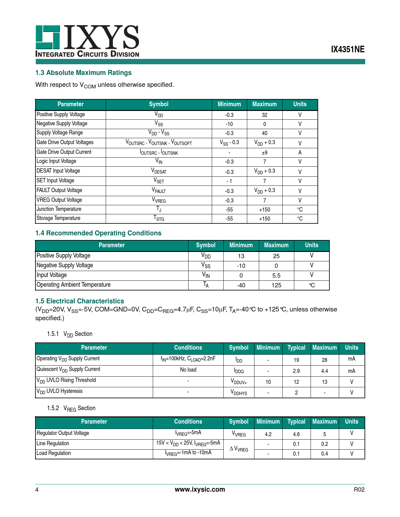 IX4351NE. 1.3 Absolute Maximum Ratings. Parameter. Symbol. Minimum. Maximum. Units. 1.4 Recommended Operating Conditions