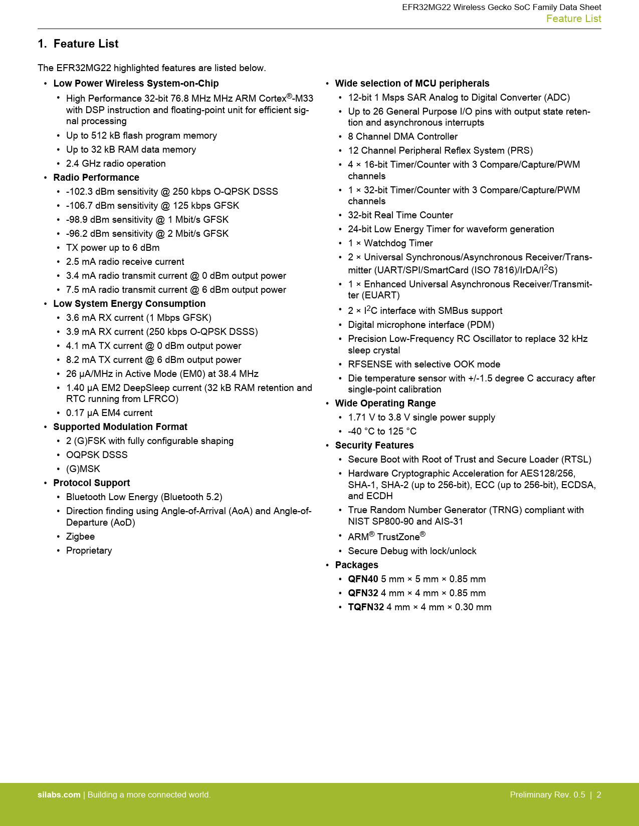 EFR32MG22 Wireless Gecko SoC Family Data Sheet Feature List 1. Feature List The EFR32MG22 highlighted features are listed below. • Low Power Wireless System-on-Chip • Wide selection of MCU peripherals • High Performance 32-bit 76.8 MHz MHz ARM Cortex®-M33 • 12-bit 1 Msps SAR Analog to Digital Converter (ADC) with DSP instruction and floating-point unit for efficient sig- • Up to 26 General Purpose I/O pins with output state reten- nal processing tion and asynchronous interrupts • Up to 512 kB flash program memory • 8 Channel DMA Controller • Up to 32 kB RAM data memory • 12 Channel Peripheral Reflex System (PRS) • 2.4 GHz radio operation • 4 × 16-bit Timer/Counter with 3 Compare/Capture/PWM • Radio Performance channels • -102.3 dBm sensitivity @ 250 kbps O-QPSK DSSS • 1 × 32-bit Timer/Counter with 3 Compare/Capture/PWM • -106.7 dBm sensitivity @ 125 kbps GFSK channels • -98.9 dBm sensitivity @ 1 Mbit/s GFSK • 32-bit Real Time Counter • -96.2 dBm sensitivity @ 2 Mbit/s GFSK • 24-bit Low Energy Timer for waveform generation • TX power up to 6 dBm • 1 × Watchdog Timer • 2.5 mA radio receive current • 2 × Universal Synchronous/Asynchronous Receiver/Trans- mitter (UART/SPI/SmartCard (ISO 7816)/IrDA/I2S) • 3.4 mA radio transmit current @ 0 dBm output power • 1 × Enhanced Universal Asynchronous Receiver/Transmit- • 7.5 mA radio transmit current @ 6 dBm output power ter (EUART) • Low System Energy Consumption • 2 × I2C interface with SMBus support • 3.6 mA RX current (1 Mbps GFSK) • Digital microphone interface (PDM) • 3.9 mA RX current (250 kbps O-QPSK DSSS) • Precision Low-Frequency RC Oscillator to replace 32 kHz • 4.1 mA TX current @ 0 dBm output power sleep crystal • 8.2 mA TX current @ 6 dBm output power • RFSENSE with selective OOK mode • 26 μA/MHz in Active Mode (EM0) at 38.4 MHz • Die temperature sensor with +/-1.5 degree C accuracy after • 1.40 μA EM2 DeepSleep current (32 kB RAM retention and single-point calibration RTC running from LFRCO) • Wide Operating Range • 0.17 μA EM4 current • 1.71 V to 3.8 V single power supply • Supported Modulation Format • -40 °C to 125 °C • 2 (G)FSK with fully configurable shaping • Security Features • OQPSK DSSS • Secure Boot with Root of Trust and Secure Loader (RTSL) • (G)MSK • Hardware Cryptographic Acceleration for AES128/256, • Protocol Support SHA-1, SHA-2 (up to 256-bit), ECC (up to 256-bit), ECDSA, • Bluetooth Low Energy (Bluetooth 5.2) and ECDH • Direction finding using Angle-of-Arrival (AoA) and Angle-of- • True Random Number Generator (TRNG) compliant with Departure (AoD) NIST SP800-90 and AIS-31 • Zigbee • ARM® TrustZone® • Proprietary • Secure Debug with lock/unlock • Packages • QFN40 5 mm × 5 mm × 0.85 mm • QFN32 4 mm × 4 mm × 0.85 mm • TQFN32 4 mm × 4 mm × 0.30 mm silabs.com | Building a more connected world. Preliminary Rev. 0.5 | 2 Document Outline 1. Feature List 2. Ordering Information 3. System Overview 3.1 Introduction 3.2 Radio 3.2.1 Antenna Interface 3.2.2 Fractional-N Frequency Synthesizer 3.2.3 Receiver Architecture 3.2.4 Transmitter Architecture 3.2.5 Packet and State Trace 3.2.6 Data Buffering 3.2.7 Radio Controller (RAC) 3.2.8 RFSENSE Interface 3.3 General Purpose Input/Output (GPIO) 3.4 Clocking 3.4.1 Clock Management Unit (CMU) 3.4.2 Internal and External Oscillators 3.5 Counters/Timers and PWM 3.5.1 Timer/Counter (TIMER) 3.5.2 Low Energy Timer (LETIMER) 3.5.3 Real Time Clock with Capture (RTCC) 3.5.4 Back-Up Real Time Counter 3.5.5 Watchdog Timer (WDOG) 3.6 Communications and Other Digital Peripherals 3.6.1 Universal Synchronous/Asynchronous Receiver/Transmitter (USART) 3.6.2 Enhanced Universal Asynchronous Receiver/Transmitter (EUART) 3.6.3 Inter-Integrated Circuit Interface (I2C) 3.6.4 Peripheral Reflex System (PRS) 3.6.5 Pulse Density Modulation (PDM) Interface 3.7 Security Features 3.7.1 Secure Boot with Root of Trust and Secure Loader (RTSL) 3.7.2 Cryptographic Accelerator 3.7.3 True Random Number Generator 3.7.4 Secure Debug with Lock/Unlock 3.8 Analog 3.8.1 Analog to Digital Converter (IADC) 3.9 Power 3.9.1 Energy Management Unit (EMU) 3.9.2 Voltage Scaling 3.9.3 DC-DC Converter 3.9.4 Power Domains 3.10 Reset Management Unit (RMU) 3.11 Core and Memory 3.11.1 Processor Core 3.11.2 Memory System Controller (MSC) 3.11.3 Linked Direct Memory Access Controller (LDMA) 3.12 Memory Map 3.13 Configuration Summary 4. Electrical Specifications 4.1 Electrical Characteristics 4.2 Absolute Maximum Ratings 4.3 General Operating Conditions 4.4 DC-DC Converter 4.4.1 DC-DC Operating Limits 4.5 Thermal Characteristics 4.6 Current Consumption 4.6.1 MCU current consumption using DC-DC at 3.0 V input 4.6.2 MCU current consumption at 3.0 V 4.6.3 MCU current consumption at 1.8 V 4.6.4 Radio current consumption at 3.0V using DCDC 4.7 Flash Characteristics 4.8 Wake Up, Entry, and Exit times 4.9 RFSENSE Low-energy Wake-on-RF 4.10 2.4 GHz RF Transceiver Characteristics 4.10.1 RF Transmitter Characteristics 4.10.1.1 RF Transmitter General Characteristics for the 2.4 GHz Band 4.10.1.2 RF Transmitter Characteristics for 802.15.4 DSSS-OQPSK in the 2.4 GHz Band 4.10.1.3 RF Transmitter Characteristics for Bluetooth Low Energy in the 2.4 GHz Band 1 Mbps Data Rate 4.10.1.4 RF Transmitter Characteristics for Bluetooth Low Energy in the 2.4 GHz Band 2 Mbps Data Rate 4.10.1.5 RF Transmitter Characteristics for Bluetooth Low Energy in the 2.4 GHz Band 500 kbps Data Rate 4.10.1.6 RF Transmitter Characteristics for Bluetooth Low Energy in the 2.4 GHz Band 125 kbps Data Rate 4.10.2 RF Receiver Characteristics 4.10.2.1 RF Receiver General Characteristics for the 2.4 GHz Band 4.10.2.2 RF Receiver Characteristics for 802.15.4 DSSS-OQPSK in the 2.4 GHz Band 4.10.2.3 RF Receiver Characteristics for Bluetooth Low Energy in the 2.4 GHz Band 1 Mbps Data Rate 4.10.2.4 RF Receiver Characteristics for Bluetooth Low Energy in the