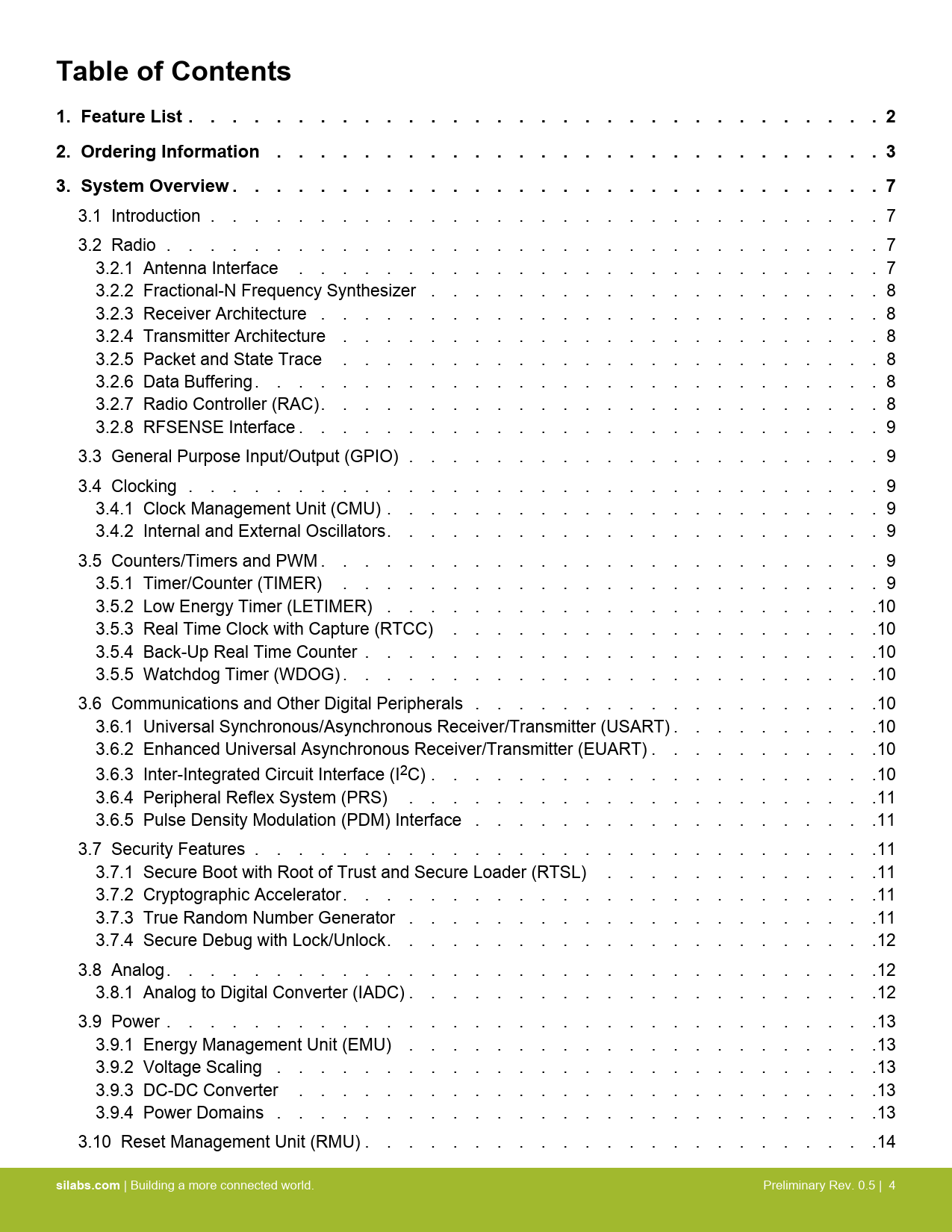 Table of Contents 1 Feature List  2 2 Ordering Information  3 3 System Overview  7 silabs.com