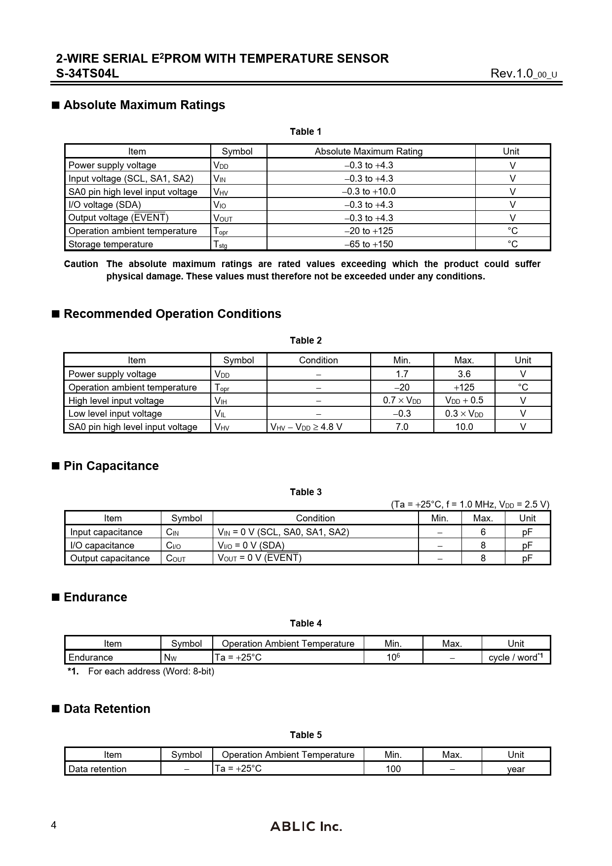 2-WIRE SERIAL E2PROM WITH TEMPERATURE SENSOR S-34TS04L. Absolute Maximum Ratings. Table 1