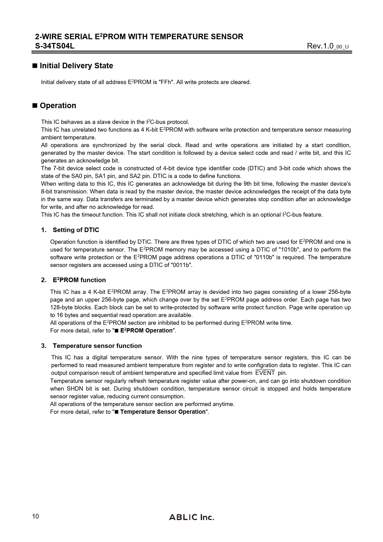 2-WIRE SERIAL E2PROM WITH TEMPERATURE SENSOR S-34TS04L Rev.1.0_00_U Initial Delivery State Initial delivery state of all address E2PROM is "FFh". All write protects are cleared. Operation This IC behaves as a slave device in the I2C-bus protocol. This IC has unrelated two functions as 4 K-bit E2PROM with software write protection and temperature sensor measuring ambient temperature. All operations are synchronized by the serial clock. Read and write operations are initiated by a start condition, generated by the master device. The start condition is followed by a device select code and read / write bit, and this IC generates an acknowledge bit. The 7-bit device select code is constructed of 4-bit device type identifier code (DTIC) and 3-bit code which shows the state of the SA0 pin, SA1 pin, and SA2 pin. DTIC is a code to define functions. When writing data to this IC, this IC generates an acknowledge bit during the 9th bit time, following the master device's 8-bit transmission. When data is read by the master device, the master device acknowledges the receipt of the data byte in the same way. Data transfers are terminated by a master device which generates stop condition after an acknowledge for write, and after no acknowledge for read. This IC has the timeout function. This IC shall not initiate clock stretching, which is an optional I2C-bus feature. 1. Setting of DTIC Operation function is identified by DTIC. There are three types of DTIC of which two are used for E2PROM and one is used for temperature sensor. The E2PROM memory may be accessed using a DTIC of "1010b", and to perform the software write protection or the E2PROM page address operations a DTIC of "0110b" is required. The temperature sensor registers are accessed using a DTIC of "0011b". 2. E2PROM function This IC has a 4 K-bit E2PROM array. The E2PROM array is devided into two pages consisting of a lower 256-byte page and an upper 256-byte page, which change over by the set E2PROM page address order. Each page has two 128-byte blocks. Each block can be set to write-protected by software write protect function. Page write operation up to 16 bytes and sequential read operation are available. All operations of the E2PROM section are inhibited to be performed during E2PROM write time. For more detail, refer to " E2PROM Operation ". 3. Temperature sensor function This IC has a digital temperature sensor. With the nine types of temperature sensor registers, this IC can be performed to read measured ambient temperature from register and to write configration data to register. This IC can ___________ output comparison result of ambient temperature and specified limit value from EVENT pin. Temperature sensor regularly refresh temperature register value after power-on, and can go into shutdown condition when SHDN bit is set. During shutdown condition, temperature sensor circuit is stopped and holds temperature sensor register value, reducing current consumption. All operations of the temperature sensor section are performed anytime. For more detail, refer to " Temperature Sensor Operation ". 10