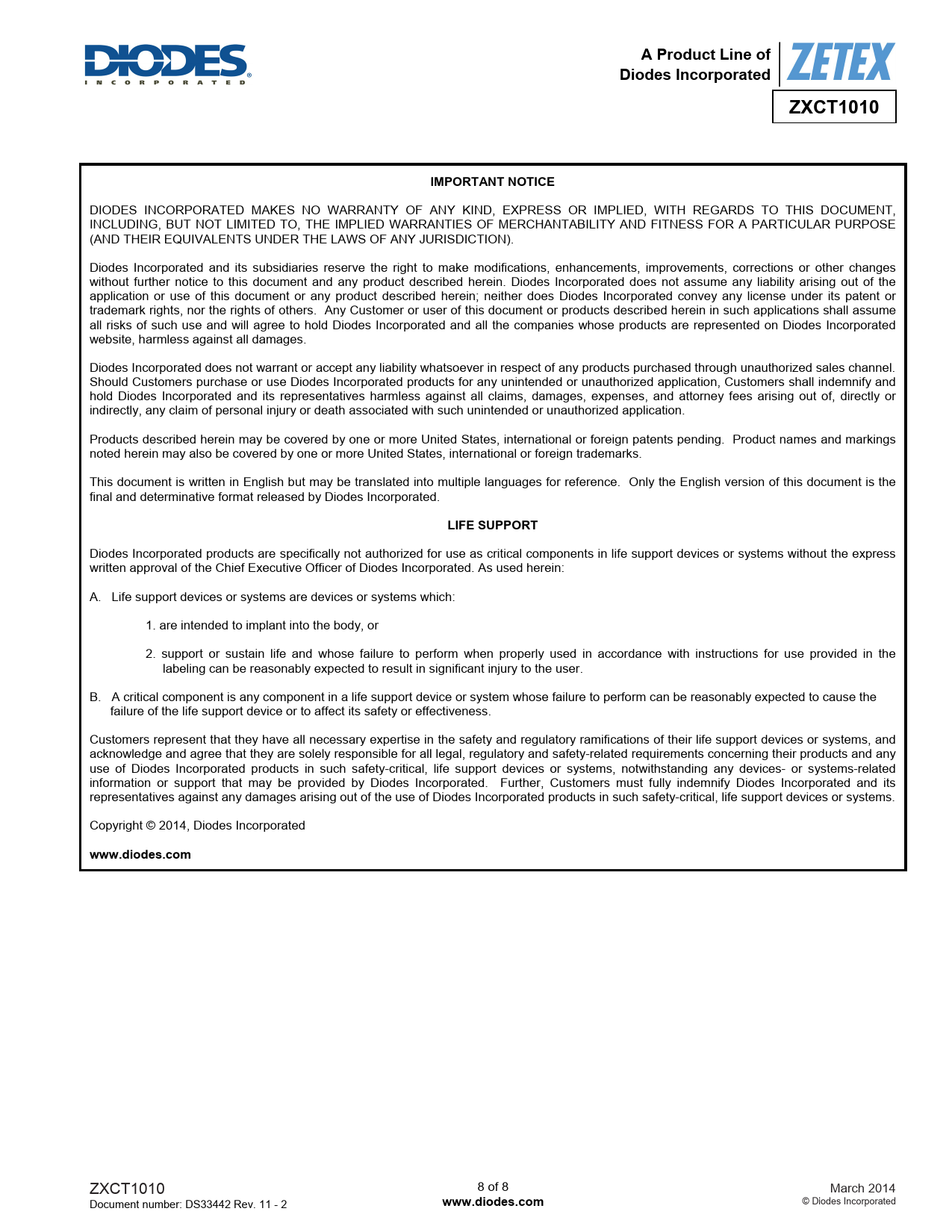 | Seiten / Seite | 8 / 8 — A Product Line of. Diodes Incorporated. ZXCT1010. IMPORTANT NOTICE. LIFE … |