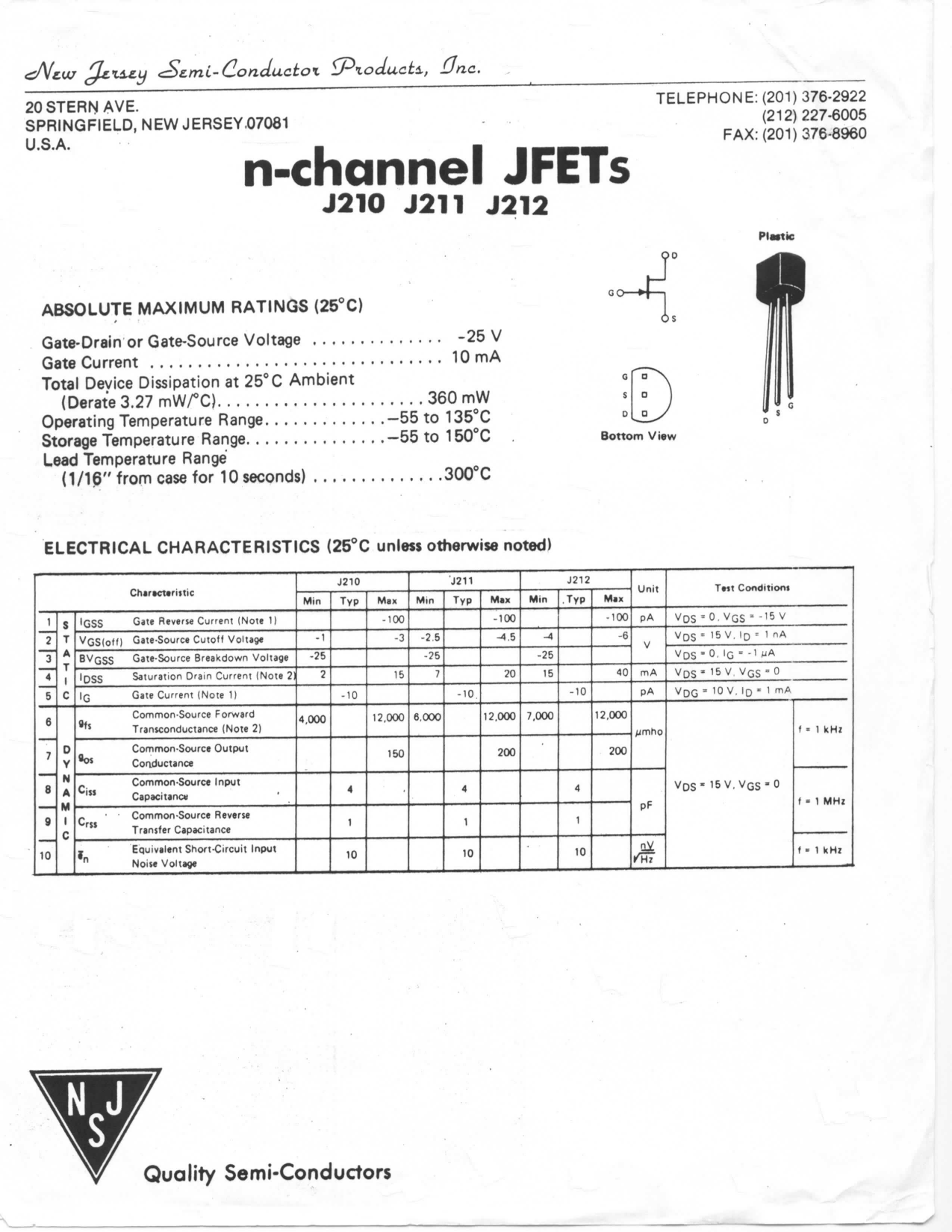 Datasheet J210, J211, J212 (New Jersey Semiconductor)