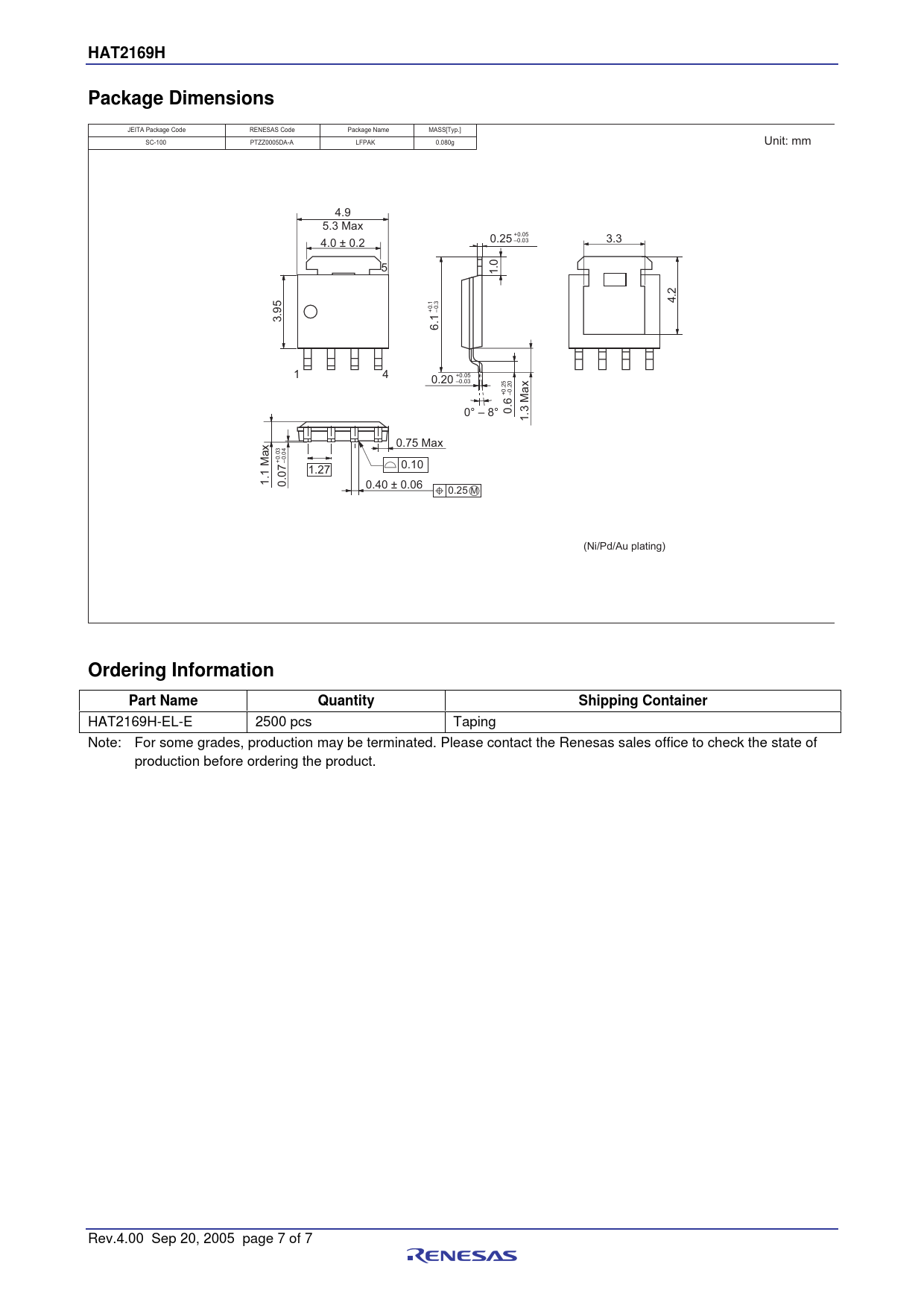 HAT2169H Package Dimensions JEITA Package Code RENESAS Code SC-100 PTZZ0005DA-A Package Name MASS[Typ.] LFPAK Unit: mm 0.080g 4.9 5.3 Max 4.0 ± 0.2 +0.05 4.2 6.1 –0.3 +0.1 3.95 5 4 0° – 8° +0.25 +0.05 0.20 –0.03 0.6 –0.20 1.3 Max 1 1.1 Max +0.03 0.07 –0.04 3.3 1.0 0.25 –0.03 0.75 Max 0.10 1.27 0.40 ± 0.06 0.25 M (Ni/Pd/Au plating) Ordering Information Part Name HAT2169H-EL-E Quantity 2500 pcs Shipping Container Taping Note: For some grades, production may be terminated. Please contact the Renesas sales office to check the state of production before ordering the product. Rev.4.00 Sep 20, 2005 page 7 of 7