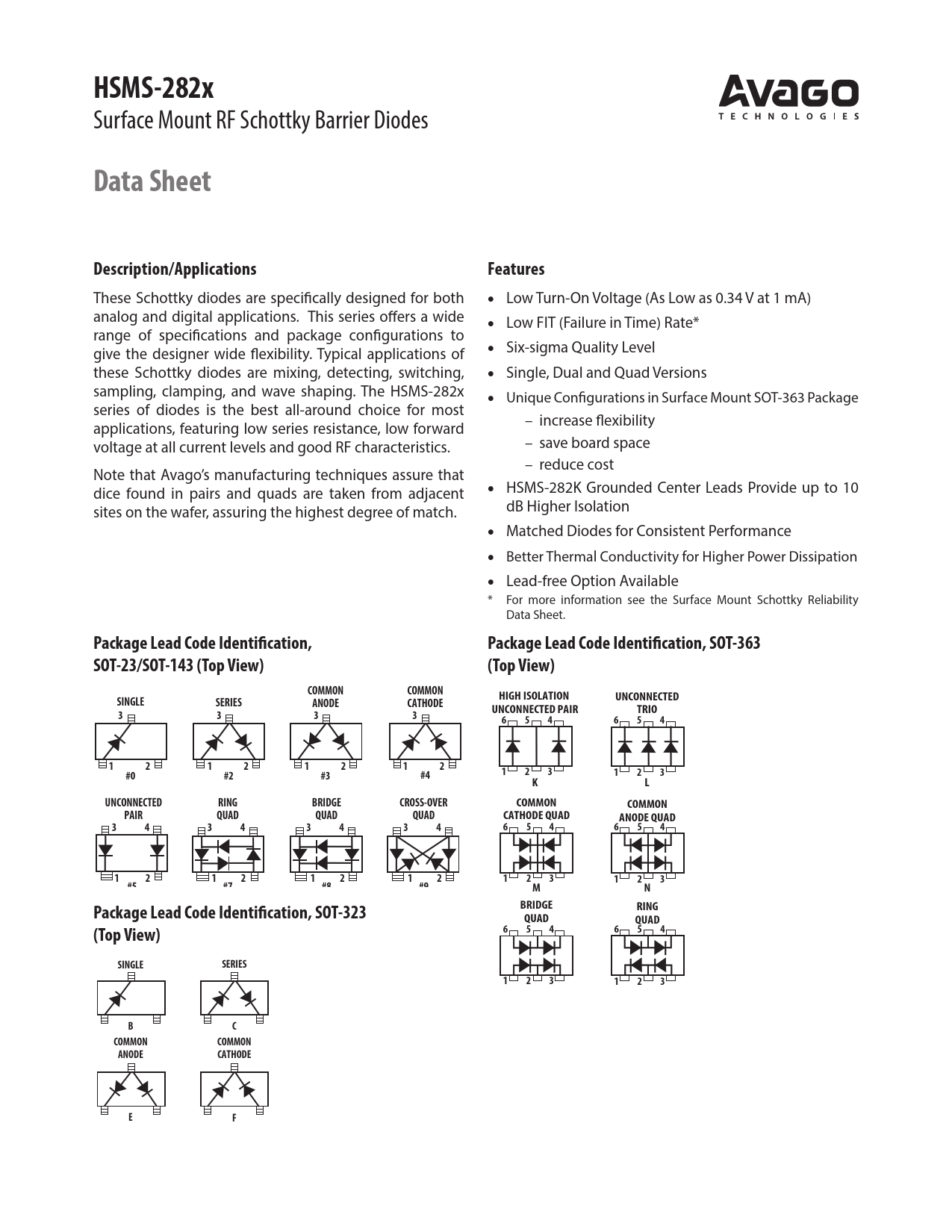 HSMS-282x Surface Mount RF Schottky Barrier Diodes Data SheetDescription/ApplicationsFeatures These Schottky diodes are specifically designed for both • Low Turn‑On Voltage (As Low as 0.34 V at 1 mA) analog and digital applications. This series offers a wide • Low FIT (Failure in Time) Rate* range of specifica tions and package con figura tions to give the designer wide flexi bility. Typical applications of • Six‑sigma Quality Level these Schottky diodes are mixing, detecting, switching, • Single, Dual and Quad Versions sampling, clamping, and wave shaping. The HSMS‑282x • Unique Configurations in Surface Mount SOT‑363 Package series of diodes is the best all‑around choice for most applications, featuring low series resistance, low forward – increase flexibility voltage at all current levels and good RF characteristics. – save board space – reduce cost Note that Avago’s manufacturing techniques assure that dice found in pairs and quads are taken from adjacent • HSMS‑282K Grounded Center Leads Provide up to 10 sites on the wafer, assuring the highest degree of match. dB Higher Isolation • Matched Diodes for Consistent Performance • Better Thermal Conductivity for Higher Power Dissipation • Lead‑free Option Available * For more information see the Surface Mount Schottky Reliability Data Sheet. Package Lead Code Identification,Package Lead Code Identification, SOT-363SOT-23/SOT-143 (Top View)(Top View)COMMONCOMMONSINGLESERIESHIGH ISOLATIONANODECATHODEUNCONNECTED3333UNCONNECTED PAIRTRIO65465412121212#0#2#3#4123123KLUNCONNECTEDRINGBRIDGECROSS-OVERCOMMONCOMMONPAIRQUADQUADQUADCATHODE QUADANODE QUAD3434343465465412121212123123#5#7#8#9MNPackage Lead Code Identification, SOT-323BRIDGERINGQUADQUAD(Top View)654654SINGLESERIES123123PRBCCOMMONCOMMONANODECATHODEEF