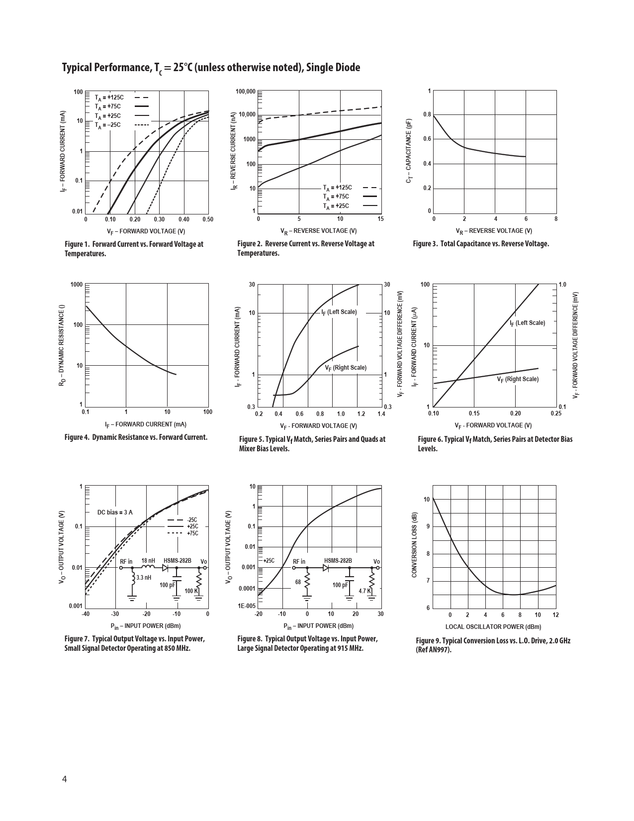 A) 100 IF (Left Scale) 10 10 VF (Right Scale) – DYNAMIC RESISTANCE 1 1 V R D - FORWARD CURRENT ( I - FORWARD CURRENT (mA) F I F F (Right Scale) - FORWARD VOLTAGE DIFFERENCE (mV) - FORWARD VOLTAGE DIFFERENCE (mV) V F V F 1 0.3 0.3 1 0.1 0.1 1 10 100 0.2 0.4 0.6 0.8 1.0 1.2 1.4 0.10 0.15 0.20 0.25 IF – FORWARD CURRENT (mA) VF - FORWARD VOLTAGE (V) VF - FORWARD VOLTAGE (V) Figure 4. Dynamic Resistance vs. Forward Current. Figure 5. Typical Vf Match, Series Pairs and Quads at Figure 6. Typical Vf Match, Series Pairs at Detector Bias Mixer Bias Levels. Levels. 1 10 10 1 DC bias = 3 A (V) -25C (V) 0.1 +25C 0.1 9 +75C 0.01 8 RF in 18 nH HSMS-282B Vo +25C RF in HSMS-282B Vo 0.01 0.001 – OUTPUT VOLTAGE 3.3 nH – OUTPUT VOLTAGE CONVERSION LOSS (dB) V O 100 pF V O 68 100 pF 7 100 K 0.0001 4.7 K 0.001 1E-005 6 -40 -30 -20 -10 0 -20 -10 0 10 20 30 0 2 4 6 8 10 12 Pin – INPUT POWER (dBm) Pin – INPUT POWER (dBm) LOCAL OSCILLATOR POWER (dBm) Figure 7. Typical Output Voltage vs. Input Power, Figure 8. Typical Output Voltage vs. Input Power, Figure 9. Typical Conversion Loss vs. L.O. Drive, 2.0 GHz Small Signal Detector Operating at 850 MHz. Large Signal Detector Operating at 915 MHz. (Ref AN997).