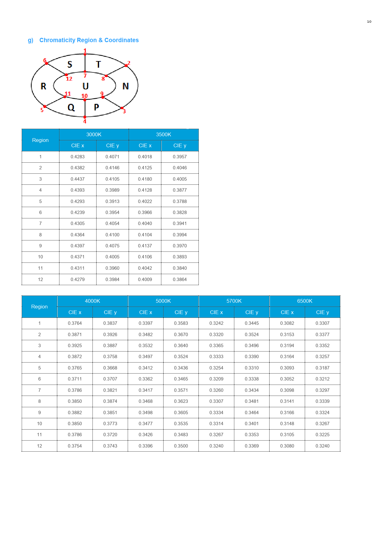 3000K 3500K Region CIE x CIE y CIE x CIE y 1 0.4283 0.4071 0.4018 0.3957 2 0.4382 0.4146 0.4125 0.4046 3 0.4437 0.4105 0.4180 0.4005 4 0.4393 0.3989 0.4128 0.3877 5 0.4293 0.3913 0.4022 0.3788 6 0.4239 0.3954 0.3966 0.3828 7 0.4305 0.4054 0.4040 0.3941 8 0.4364 0.4100 0.4104 0.3994 9 0.4397 0.4075 0.4137 0.3970 10 0.4371 0.4005 0.4106 0.3893 11 0.4311 0.3960 0.4042 0.3840 12 0.4279 0.3984 0.4009 0.3864 4000K 5000K 5700K 6500K Region CIE x CIE y CIE x CIE y CIE x CIE y CIE x CIE y 1 0.3764 0.3837 0.3397 0.3583 0.3242 0.3445 0.3082 0.3307 2 0.3871 0.3926 0.3482 0.3670 0.3320 0.3524 0.3153 0.3377 3 0.3925 0.3887 0.3532 0.3640 0.3365 0.3496 0.3194 0.3352 4 0.3872 0.3758 0.3497 0.3524 0.3333 0.3390 0.3164 0.3257 5 0.3765 0.3668 0.3412 0.3436 0.3254 0.3310 0.3093 0.3187 6 0.3711 0.3707 0.3362 0.3465 0.3209 0.3338 0.3052 0.3212 7 0.3786 0.3821 0.3417 0.3571 0.3260 0.3434 0.3098 0.3297 8 0.3850 0.3874 0.3468 0.3623 0.3307 0.3481 0.3141 0.3339 9 0.3882 0.3851 0.3498 0.3605 0.3334 0.3464 0.3166 0.3324 10 0.3850 0.3773 0.3477 0.3535 0.3314 0.3401 0.3148 0.3267 11 0.3786 0.3720 0.3426 0.3483 0.3267 0.3353 0.3105 0.3225 12 0.3754 0.3743 0.3396 0.3500 0.3240 0.3369 0.3080 0.3240