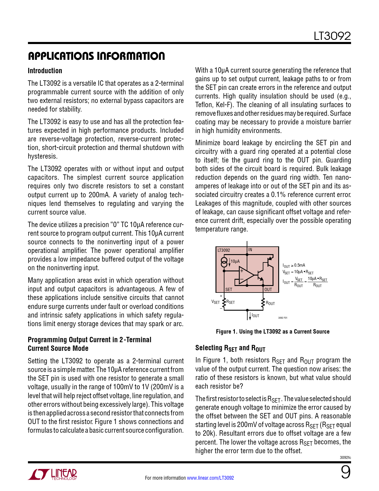 LT3092 applicaTions inForMaTion Introduction With a 10μA current source generating the reference that The LT3092 is a versatile IC that operates as a 2-terminal gains up to set output current, leakage paths to or from programmable current source with the addition of only the SET pin can create errors in the reference and output two external resistors; no external bypass capacitors are currents. High quality insulation should be used (e.g., needed for stability. Teflon, Kel-F). The cleaning of all insulating surfaces to remove fluxes and other residues may be required. Surface The LT3092 is easy to use and has all the protection fea- coating may be necessary to provide a moisture barrier tures expected in high performance products. Included in high humidity environments. are reverse-voltage protection, reverse-current protec- Minimize board leakage by encircling the SET pin and tion, short-circuit protection and thermal shutdown with circuitry with a guard ring operated at a potential close hysteresis. to itself; tie the guard ring to the OUT pin. Guarding The LT3092 operates with or without input and output both sides of the circuit board is required. Bulk leakage capacitors. The simplest current source application reduction depends on the guard ring width. Ten nano- requires only two discrete resistors to set a constant amperes of leakage into or out of the SET pin and its as- output current up to 200mA. A variety of analog tech- sociated circuitry creates a 0.1% reference current error. niques lend themselves to regulating and varying the Leakages of this magnitude, coupled with other sources current source value. of leakage, can cause significant offset voltage and refer- The device utilizes a precision “0” TC 10μA reference cur- ence current drift, especially over the possible operating rent source to program output current. This 10µA current temperature range. source connects to the noninverting input of a power operational amplifier. The power operational amplifier LT3092 IN provides a low impedance buffered output of the voltage 10µA on the noninverting input. IOUT ≥ 0.5mA + VSET = 10µA •RSET Many application areas exist in which operation without – I VSET 10µA •RSET OUT = = input and output capacitors is advantageous. A few of ROUT ROUT SET OUT these applications include sensitive circuits that cannot + V endure surge currents under fault or overload conditions SET RSET ROUT – and intrinsic safety applications in which safety regula- IOUT 3092 F01 tions limit energy storage devices that may spark or arc. Figure 1. Using the LT3092 as a Current SourceProgramming Output Current in 2-TerminalCurrent Source ModeSelecting RSET and ROUT Setting the LT3092 to operate as a 2-terminal current In Figure 1, both resistors RSET and ROUT program the source is a simple matter. The 10µA reference current from value of the output current. The question now arises: the the SET pin is used with one resistor to generate a small ratio of these resistors is known, but what value should voltage, usually in the range of 100mV to 1V (200mV is a each resistor be? level that will help reject offset voltage, line regulation, and The first resistor to select is R other errors without being excessively large). This voltage SET. The value selected should generate enough voltage to minimize the error caused by is then applied across a second resistor that connects from the offset between the SET and OUT pins. A reasonable OUT to the first resistor. Figure 1 shows connections and starting level is 200mV of voltage across R formulas to calculate a basic current source configuration. SET (RSET equal to 20k). Resultant errors due to offset voltage are a few percent. The lower the voltage across RSET becomes, the higher the error term due to the offset. 3092fc For more information www.linear.com/LT3092 9 Document Outline Description Typical Application Absolute Maximum Ratings Pin Configuration Electrical Characteristics Typical Performance Characteristics Pin Functions Applications Information Package Description Related Parts
