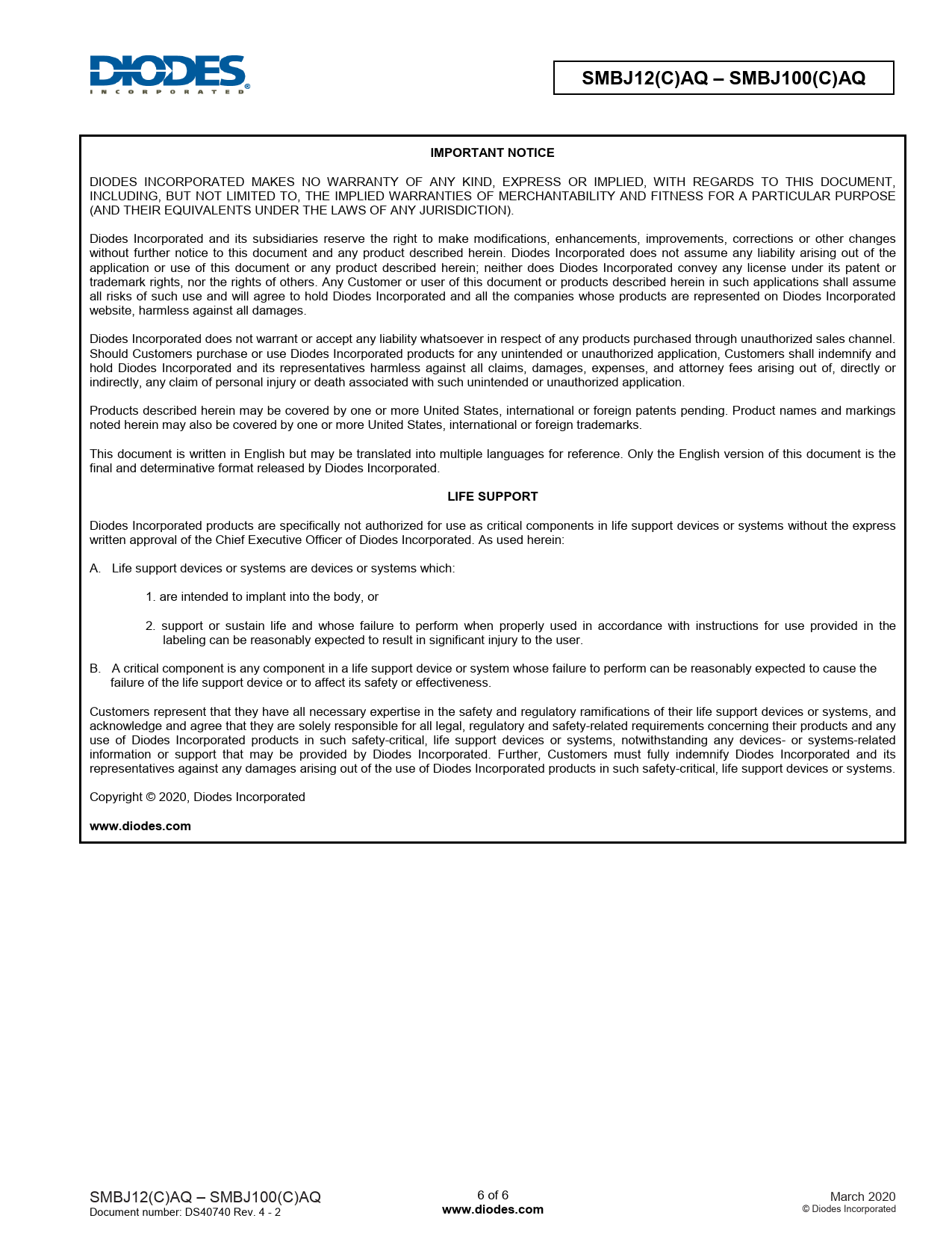 | Seiten / Seite | 6 / 6 — SMBJ12(C)AQ – SMBJ100(C)AQ. IMPORTANT NOTICE. LIFE SUPPORT. www.diodes.com |