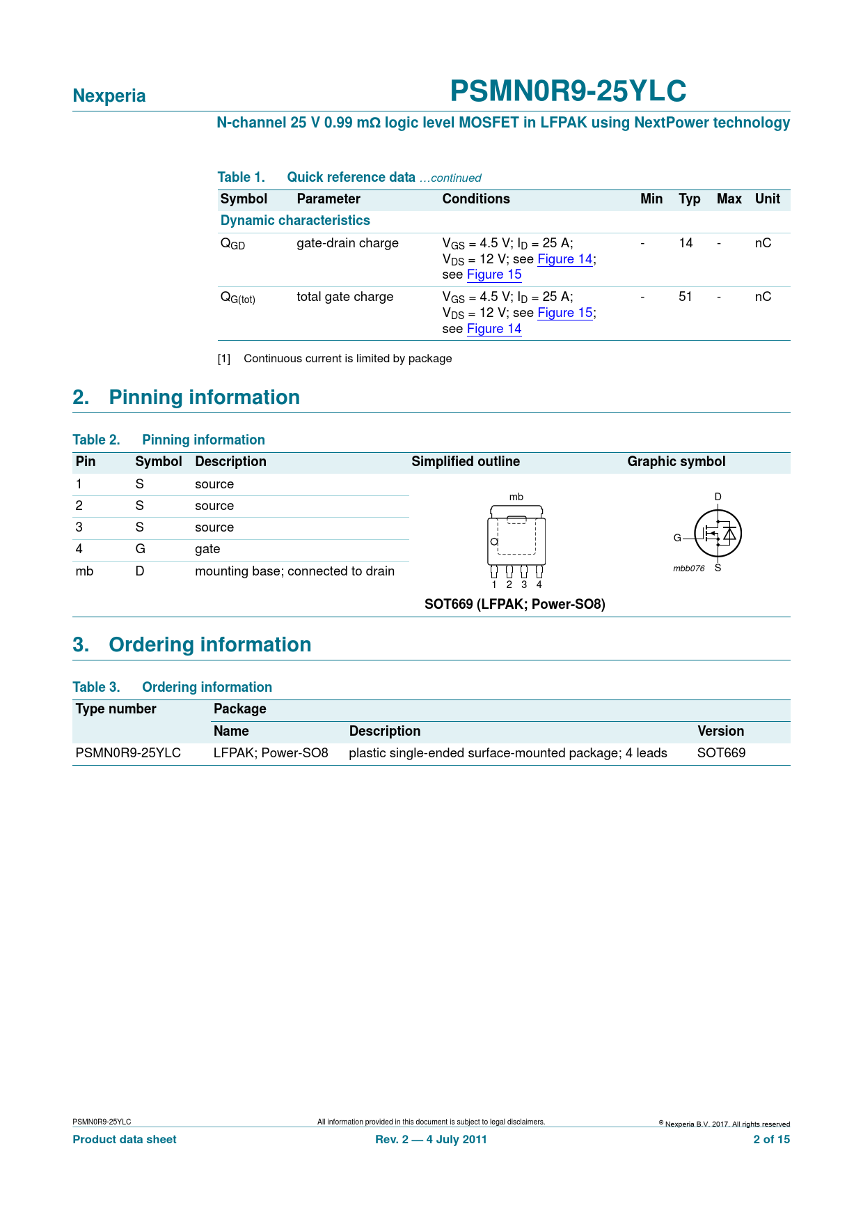 | Seiten / Seite | 15 / 2 — Nexperia. PSMN0R9-25YLC. N-channel 25 V 0.99 mΩ logic level MOSFET in … |