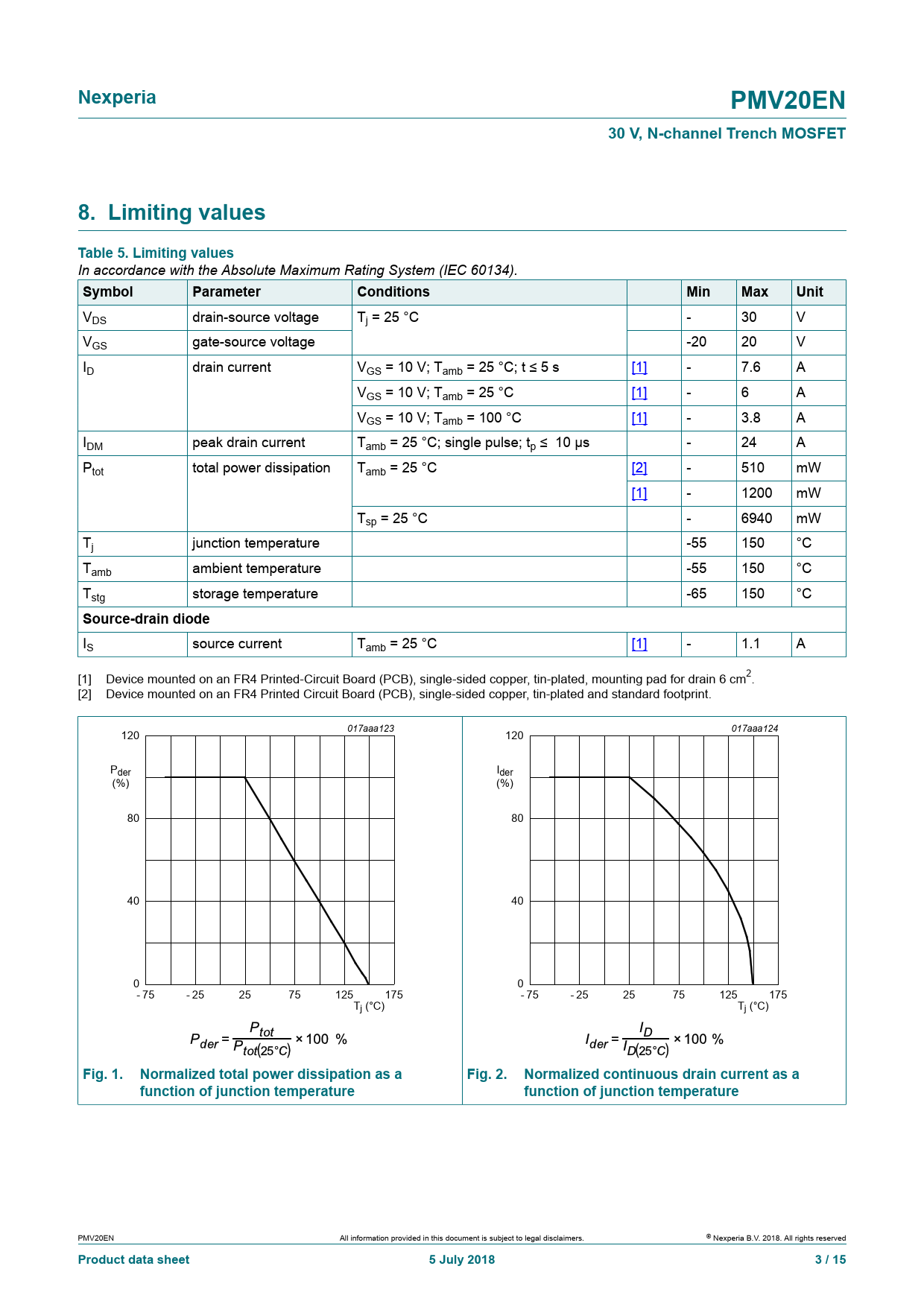 | Seiten / Seite | 15 / 3 — Nexperia. PMV20EN. 30 V, N-channel Trench MOSFET. 8. Limiting values. … |