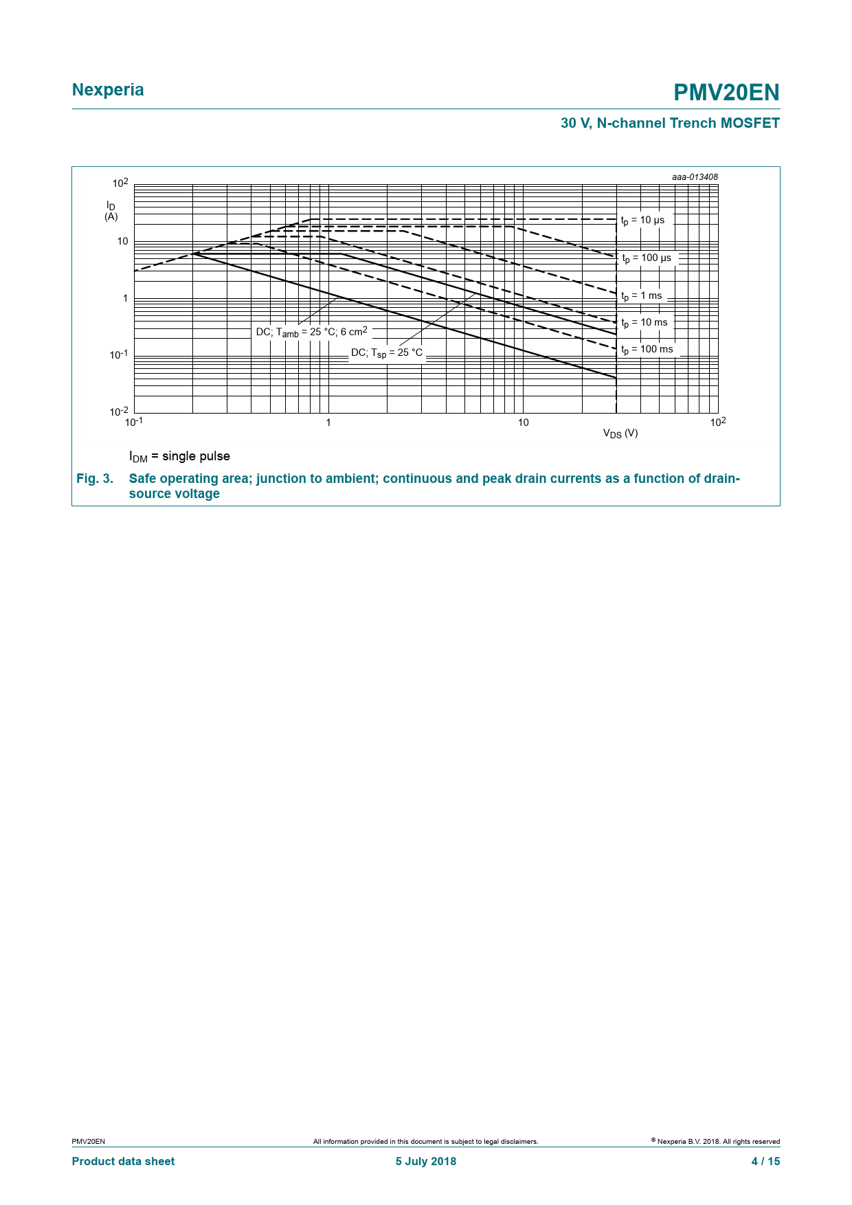aaa-013408 102 lD (A) tp = 10 µs 10 tp = 100 µs 1 tp = 1 ms tp = 10 ms DC; Tamb = 25 °C; 6 cm2 10-1 t DC; T p = 100 ms sp = 25 °C 10-210-1 1 102 10 VDS (V) IDM = single pulse
