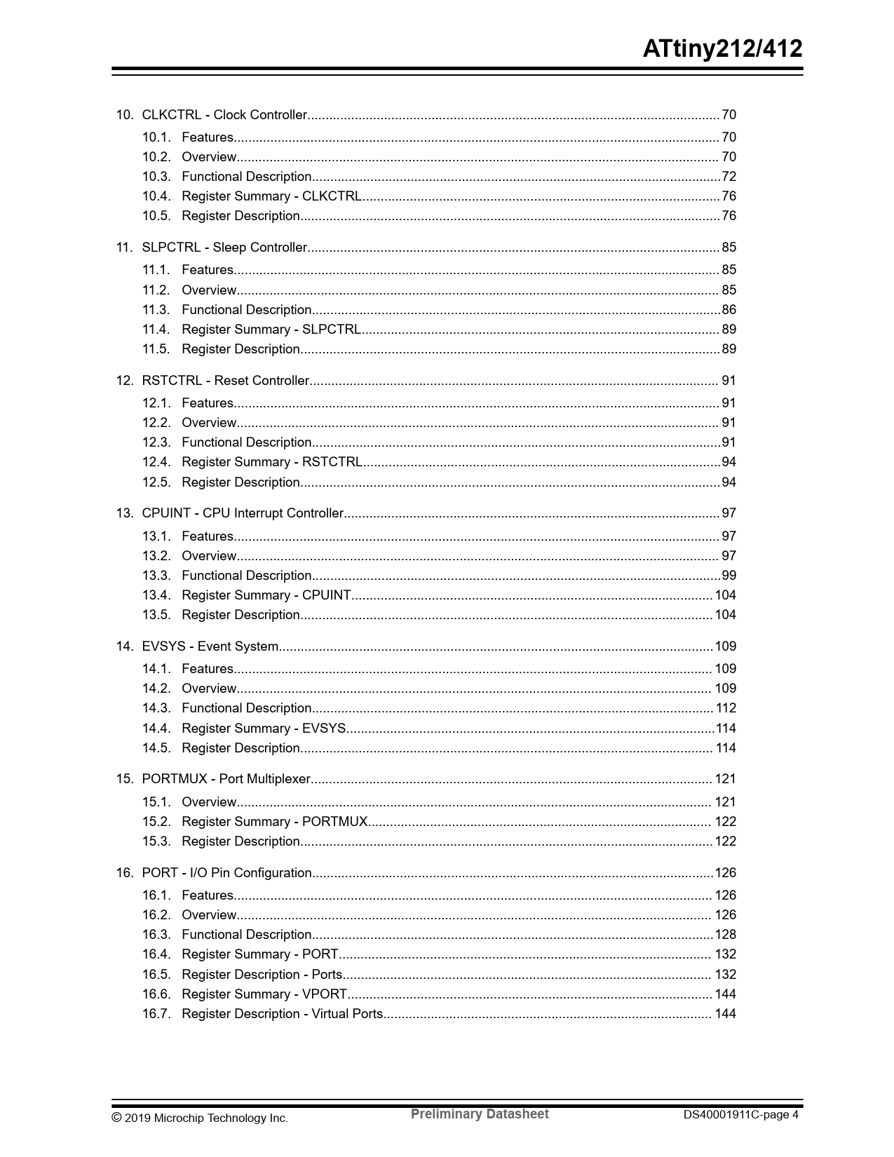 10. CLKCTRL - Clock Controller... 70 10.1. Features... 70 10.2. Overview.. 70 10.3. Functional Description..72 10.4. Register Summary - CLKCTRL.. 76 10.5. Register Description... 76 11. SLPCTRL - Sleep Controller... 85 11.1. Features... 85 11.2. Overview.. 85 11.3. Functional Description..86 11.4. Register Summary - SLPCTRL.. 89 11.5. Register Description... 89 12. RSTCTRL - Reset Controller.. 91 12.1. Features... 91 12.2. Overview.. 91 12.3. Functional Description..91 12.4. Register Summary - RSTCTRL..94 12.5. Register Description... 94 13. CPUINT - CPU Interrupt Controller... 97 13.1. Features... 97 13.2. Overview.. 97 13.3. Functional Description..99 13.4. Register Summary - CPUINT... 104 13.5. Register Description... 104 14. EVSYS - Event System...109 14.1. Features... 109 14.2. Overview.. 109 14.3. Functional Description.. 112 14.4. Register Summary - EVSYS...114 14.5. Register Description... 114 15. PORTMUX - Port Multiplexer.. 121 15.1. Overview.. 121 15.2. Register Summary - PORTMUX.. 122 15.3. Register Description... 122 16. PORT - I/O Pin Configuration..126 16.1. Features... 126 16.2. Overview.. 126 16.3. Functional Description..128 16.4. Register Summary - PORT.. 132 16.5. Register Description - Ports... 132 16.6. Register Summary - VPORT.. 144 16.7. Register Description - Virtual Ports.. 144 © 2019 Microchip Technology Inc.