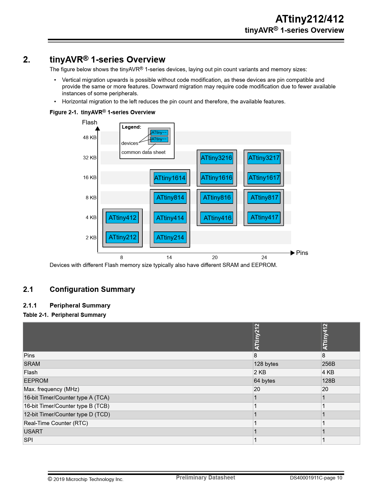 ATtiny212/412. tinyAVR® 1-series Overview. Figure 2-1. tinyAVR® 1-series Overview. Legend:. 2.1. Configuration Summary. 2.1.1