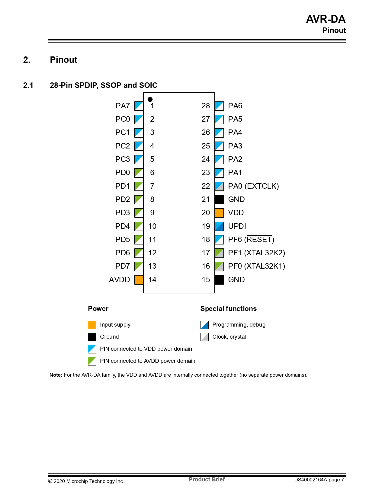 AVR-DA. Pinout. 2.1. 28-Pin SPDIP, SSOP and SOIC. Power. Special functions. Note:. Product Brief
