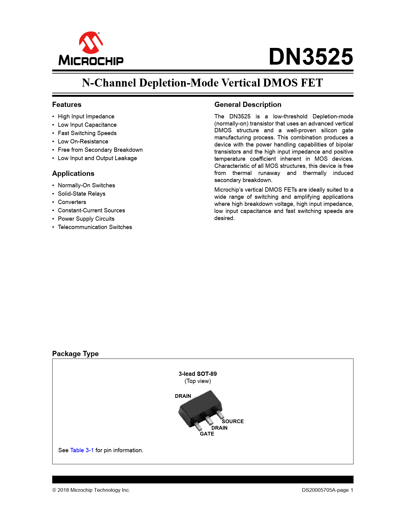 DN3525. N-Channel Depletion-Mode Vertical DMOS FET. Features. General Description. Applications. Package Type. 3-lead SOT-89. DRAIN