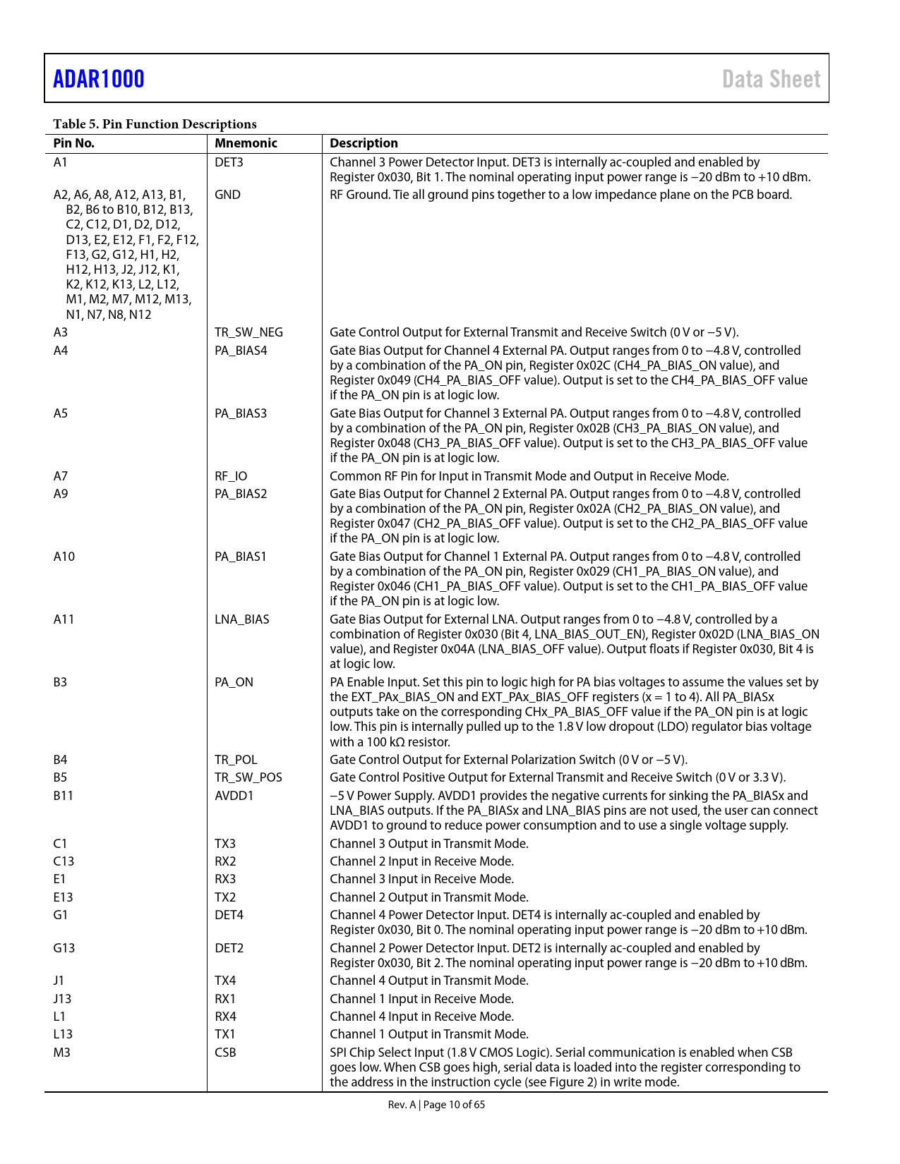 A1 DET3 Channel 3 Power Detector Input. DET3 is internally ac-coupled and enabled by Register 0x030, Bit 1. The nominal operating input power range is −20 dBm to +10 dBm. A2, A6, A8, A12, A13, B1, GND RF Ground. Tie all ground pins together to a low impedance plane on the PCB board. B2, B6 to B10, B12, B13, C2, C12, D1, D2, D12, D13, E2, E12, F1, F2, F12, F13, G2, G12, H1, H2, H12, H13, J2, J12, K1, K2, K12, K13, L2, L12, M1, M2, M7, M12, M13, N1, N7, N8, N12 A3 TR_SW_NEG Gate Control Output for External Transmit and Receive Switch (0 V or −5 V). A4 PA_BIAS4 Gate Bias Output for Channel 4 External PA. Output ranges from 0 to −4.8 V, controlled by a combination of the PA_ON pin, Register 0x02C (CH4_PA_BIAS_ON value), and Register 0x049 (CH4_PA_BIAS_OFF value). Output is set to the CH4_PA_BIAS_OFF value if the PA_ON pin is at logic low. A5 PA_BIAS3 Gate Bias Output for Channel 3 External PA. Output ranges from 0 to −4.8 V, controlled by a combination of the PA_ON pin, Register 0x02B (CH3_PA_BIAS_ON value), and Register 0x048 (CH3_PA_BIAS_OFF value). Output is set to the CH3_PA_BIAS_OFF value if the PA_ON pin is at logic low. A7 RF_IO Common RF Pin for Input in Transmit Mode and Output in Receive Mode. A9 PA_BIAS2 Gate Bias Output for Channel 2 External PA. Output ranges from 0 to −4.8 V, controlled by a combination of the PA_ON pin, Register 0x02A (CH2_PA_BIAS_ON value), and Register 0x047 (CH2_PA_BIAS_OFF value). Output is set to the CH2_PA_BIAS_OFF value if the PA_ON pin is at logic low. A10 PA_BIAS1 Gate Bias Output for Channel 1 External PA. Output ranges from 0 to −4.8 V, controlled by a combination of the PA_ON pin, Register 0x029 (CH1_PA_BIAS_ON value), and Register 0x046 (CH1_PA_BIAS_OFF value). Output is set to the CH1_PA_BIAS_OFF value if the PA_ON pin is at logic low. A11 LNA_BIAS Gate Bias Output for External LNA. Output ranges from 0 to −4.8 V, controlled by a combination of Register 0x030 (Bit 4, LNA_BIAS_OUT_EN), Register 0x02D (LNA_BIAS_ON value), and Register 0x04A (LNA_BIAS_OFF value). Output floats if Register 0x030, Bit 4 is at logic low. B3 PA_ON PA Enable Input. Set this pin to logic high for PA bias voltages to assume the values set by the EXT_PAx_BIAS_ON and EXT_PAx_BIAS_OFF registers (x = 1 to 4). All PA_BIASx outputs take on the corresponding CHx_PA_BIAS_OFF value if the PA_ON pin is at logic low. This pin is internally pulled up to the 1.8 V low dropout (LDO) regulator bias voltage with a 100 kΩ resistor. B4 TR_POL Gate Control Output for External Polarization Switch (0 V or −5 V). B5 TR_SW_POS Gate Control Positive Output for External Transmit and Receive Switch (0 V or 3.3 V). B11 AVDD1 −5 V Power Supply. AVDD1 provides the negative currents for sinking the PA_BIASx and LNA_BIAS outputs. If the PA_BIASx and LNA_BIAS pins are not used, the user can connect AVDD1 to ground to reduce power consumption and to use a single voltage supply. C1 TX3 Channel 3 Output in Transmit Mode. C13 RX2 Channel 2 Input in Receive Mode. E1 RX3 Channel 3 Input in Receive Mode. E13 TX2 Channel 2 Output in Transmit Mode. G1 DET4 Channel 4 Power Detector Input. DET4 is internally ac-coupled and enabled by Register 0x030, Bit 0. The nominal operating input power range is −20 dBm to +10 dBm. G13 DET2 Channel 2 Power Detector Input. DET2 is internally ac-coupled and enabled by Register 0x030, Bit 2. The nominal operating input power range is −20 dBm to +10 dBm. J1 TX4 Channel 4 Output in Transmit Mode. J13 RX1 Channel 1 Input in Receive Mode. L1 RX4 Channel 4 Input in Receive Mode. L13 TX1 Channel 1 Output in Transmit Mode. M3 CSB SPI Chip Select Input (1.8 V CMOS Logic). Serial communication is enabled when CSB goes low. When CSB goes high, serial data is loaded into the register corresponding to the address in the instruction cycle (see Figure 2) in write mode. Rev. A | Page 10 of 65 Document Outline Features Applications General Description Functional Block Diagram Revision History Specifications Timing Specifications Timing Diagrams SPI Block Write Mode SPI Write All Mode Absolute Maximum Ratings Thermal Resistance ESD Caution Pin Configuration and Function Descriptions Typical Performance Characteristics Theory of Operation RF Path Phase and Gain Control Power Detectors External Amplifier Bias DACs External Switch Control Transmit and Receive Control RF Subcircuit Bias Control and Enables ADC Operation Chip Addressing Memory Access Calibration Applications Information Gain Control Registers Switched Attenuator Control Phase Control Registers Transmit and Receive Subcircuit Control TR_SOURCE = 1 (TR Pin Control) TR_SOURCE = 0 (SPI Control) Transmit and Receive Switch Driver Control PA Bias Output Control LNA Bias Output Control Transmit/Receive Delay Control Transmit and Receive Mode Switching SPI Programming Example Powering the ADAR1000 Register Map Register Descriptions Outline Dimensions Ordering Guide