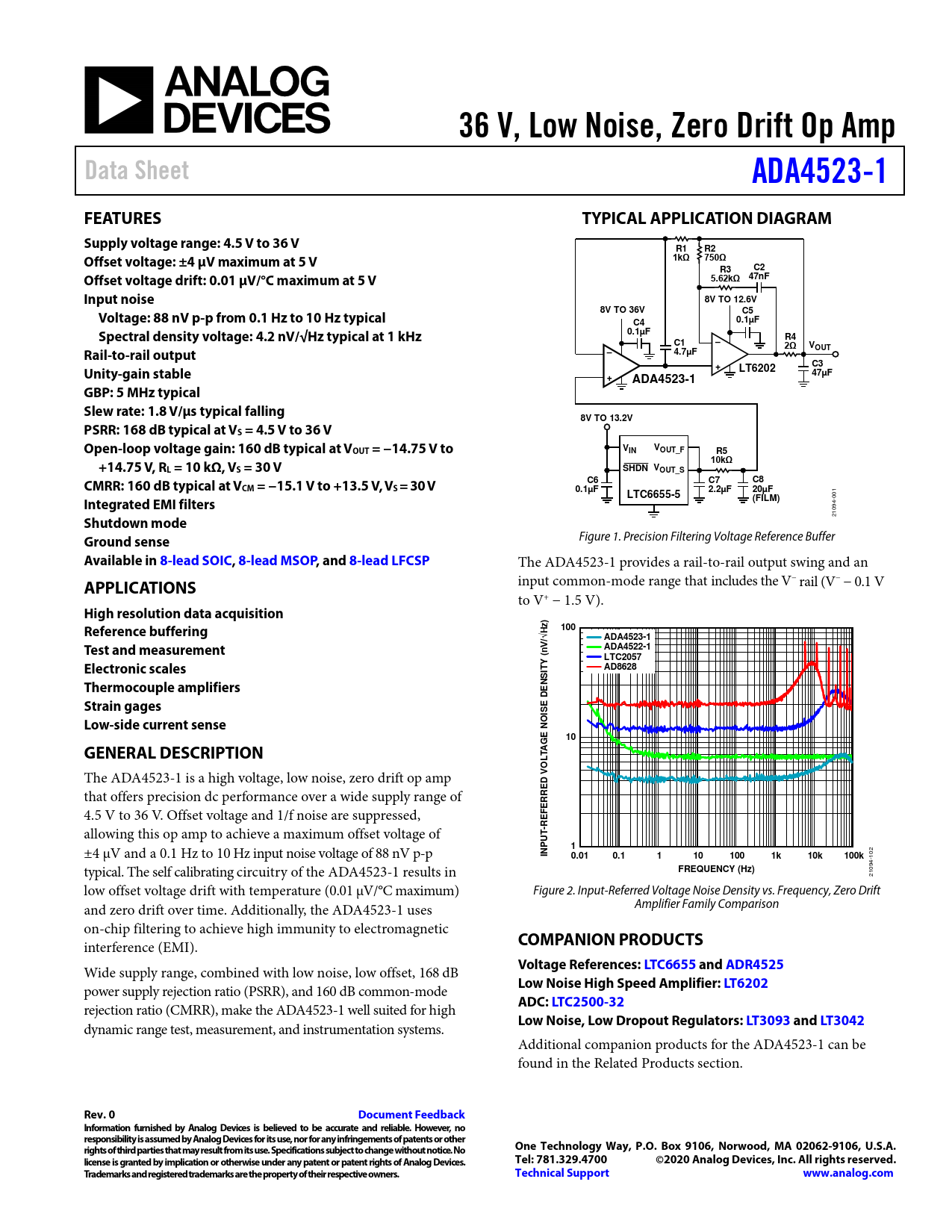 21094- low offset voltage drift with temperature (0.01 µV/°C maximum) Figure 2. Input-Referred Voltage Noise Density vs. Frequency, Zero Drift and zero drift over time. Additionally, the ADA4523-1 uses Amplifier Family Comparison on-chip filtering to achieve high immunity to electromagnetic interference (EMI).