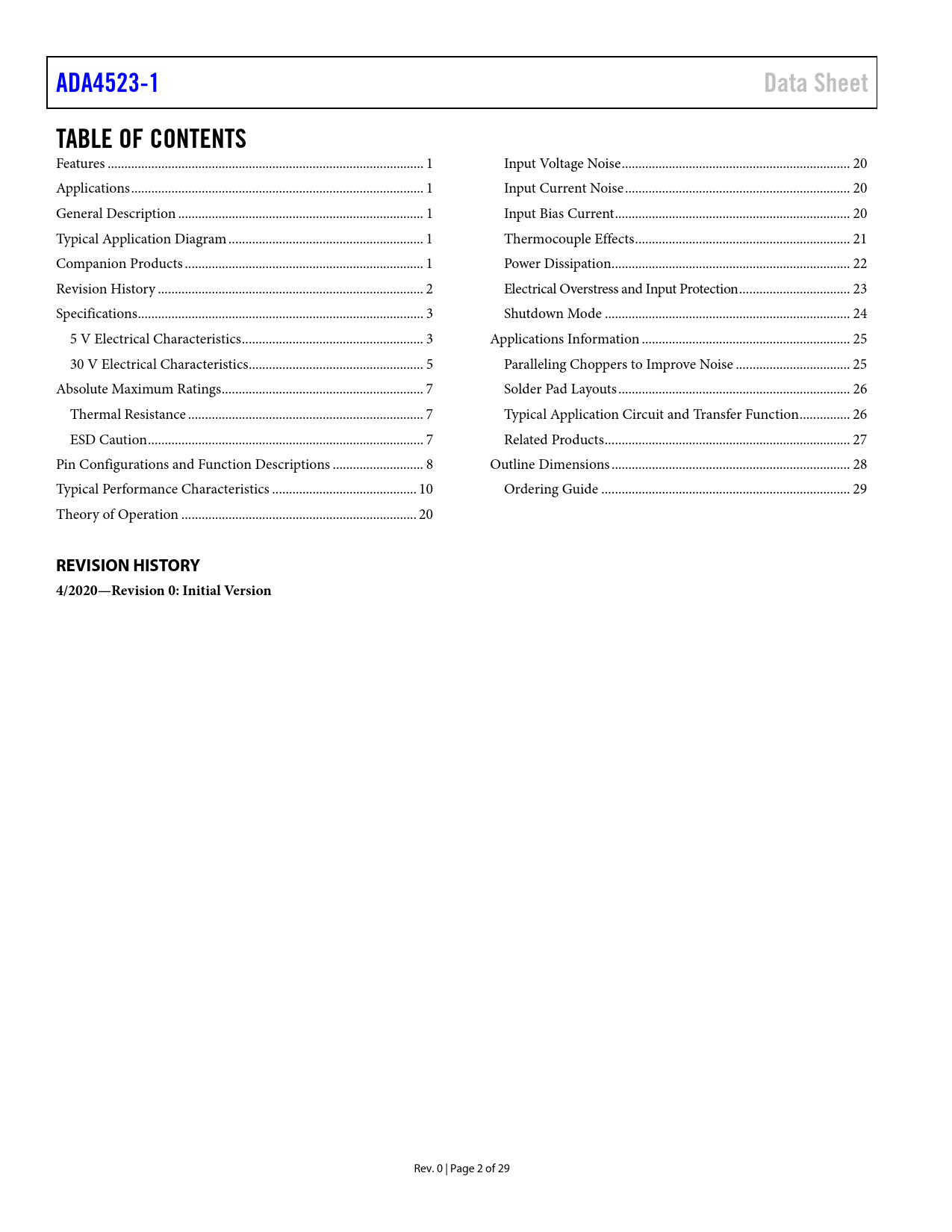 link to page 1 link to page 1 link to page 1 link to page 1 link to page 1 link to page 2 link to page 3 link to page 3 link to page 5 link to page 7 link to page 7 link to page 7 link to page 8 link to page 10 link to page 20 link to page 20 link to page 20 link to page 20 link to page 21 link to page 22 link to page 23 link to page 24 link to page 25 link to page 25 link to page 26 link to page 26 link to page 27 link to page 28 link to page 29 ADA4523-1Data SheetTABLE OF CONTENTS Features .. 1 Input Voltage Noise .. 20 Applications ... 1 Input Current Noise ... 20 General Description ... 1 Input Bias Current .. 20 Typical Application Diagram .. 1 Thermocouple Effects .. 21 Companion Products ... 1 Power Dissipation... 22 Revision History ... 2 Electrical Overstress and Input Protection ... 23 Specifications ... 3 Shutdown Mode ... 24 5 V Electrical Characteristics .. 3 Applications Information .. 25 30 V Electrical Characteristics .. 5 Paralleling Choppers to Improve Noise .. 25 Absolute Maximum Ratings .. 7 Solder Pad Layouts ... 26 Thermal Resistance .. 7 Typical Application Circuit and Transfer Function ... 26 ESD Caution .. 7 Related Products ... 27 Pin Configurations and Function Descriptions ... 8 Outline Dimensions ... 28 Typical Performance Characteristics ... 10 Ordering Guide .. 29 Theory of Operation .. 20 REVISION HISTORY 4/2020—Revision 0: Initial Version Rev. 0 | Page 2 of 29 Document Outline FEATURES APPLICATIONS GENERAL DESCRIPTION TYPICAL APPLICATION DIAGRAM COMPANION PRODUCTS TABLE OF CONTENTS REVISION HISTORY SPECIFICATIONS 5 V ELECTRICAL CHARACTERISTICS 30 V ELECTRICAL CHARACTERISTICS ABSOLUTE MAXIMUM RATINGS THERMAL RESISTANCE ESD CAUTION PIN CONFIGURATIONS AND FUNCTION DESCRIPTIONS TYPICAL PERFORMANCE CHARACTERISTICS THEORY OF OPERATION INPUT VOLTAGE NOISE INPUT CURRENT NOISE INPUT BIAS CURRENT THERMOCOUPLE EFFECTS POWER DISSIPATION ELECTRICAL OVERSTRESS AND INPUT PROTECTION SHUTDOWN MODE APPLICATIONS INFORMATION PARALLELING CHOPPERS TO IMPROVE NOISE SOLDER PAD LAYOUTS TYPICAL APPLICATION CIRCUIT AND TRANSFER FUNCTION RELATED PRODUCTS OUTLINE DIMENSIONS ORDERING GUIDE