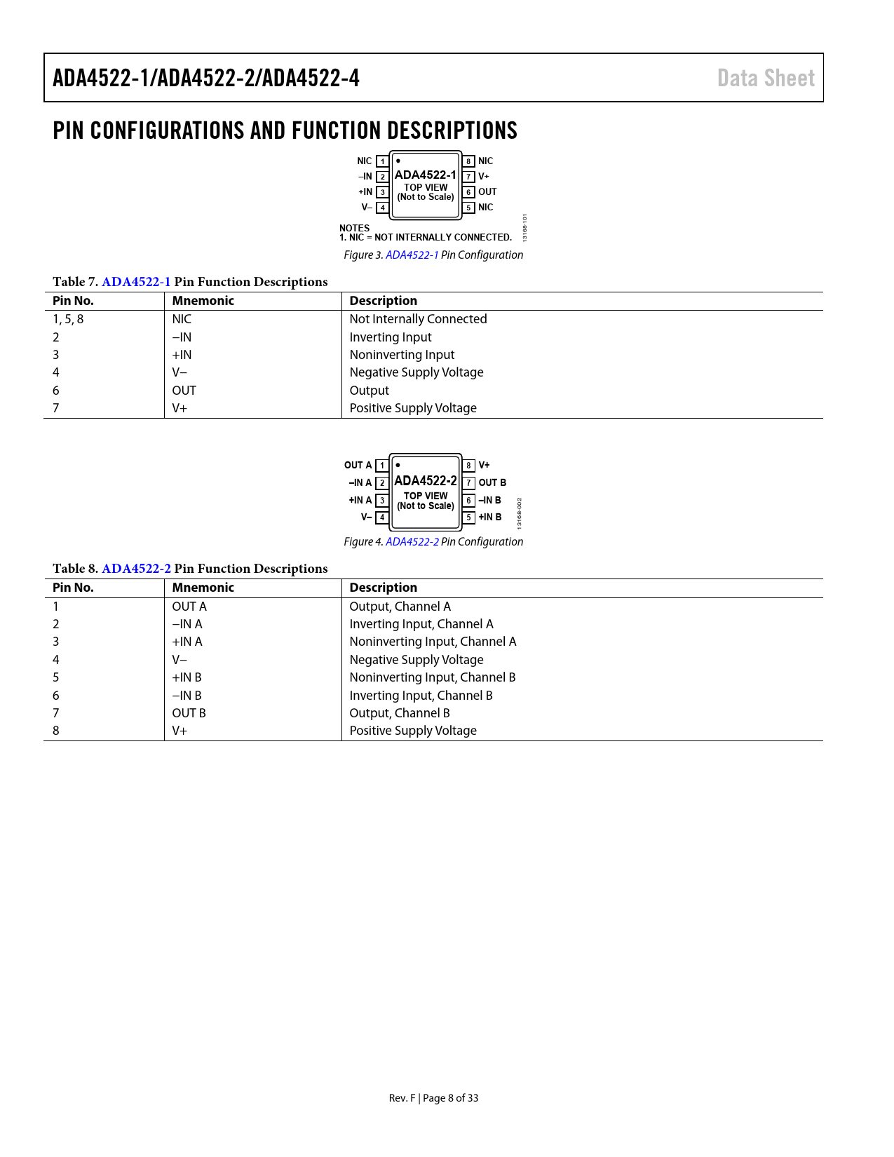 ADA4522-1/ADA4522-2/ADA4522-4. Data Sheet. PIN CONFIGURATIONS AND FUNCTION DESCRIPTIONS. NIC 1. 8 NIC. –IN 2 ADA4522-1 7 V+. +IN