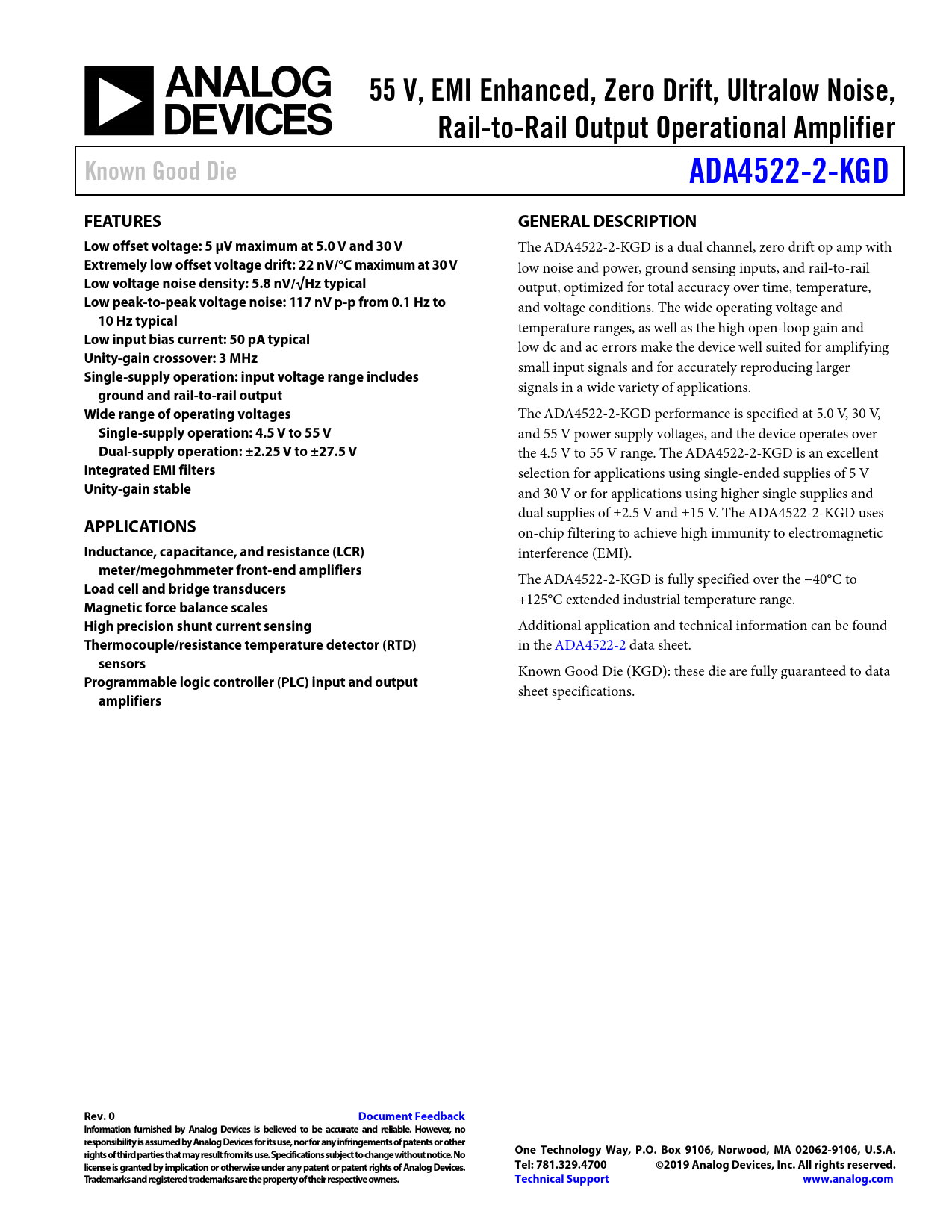 55 V, EMI Enhanced, Zero Drift, Ultralow Noise,. Rail-to-Rail Output Operational Amplifier. Known Good Die. ADA4522-2-KGD