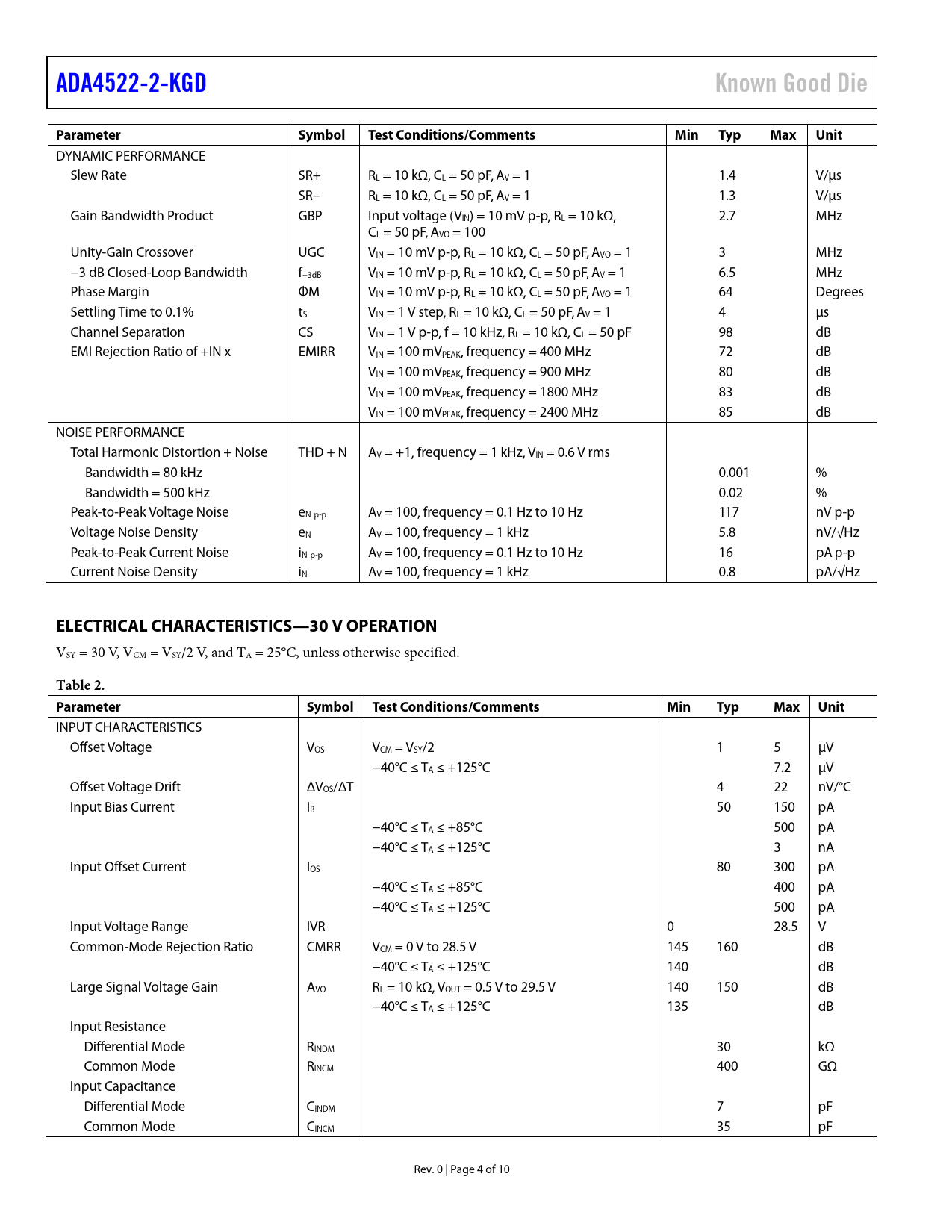ADA4522-2-KGD. Known Good Die. Parameter Symbol. Test. Conditions/Comments. Min. Typ. Max. Unit