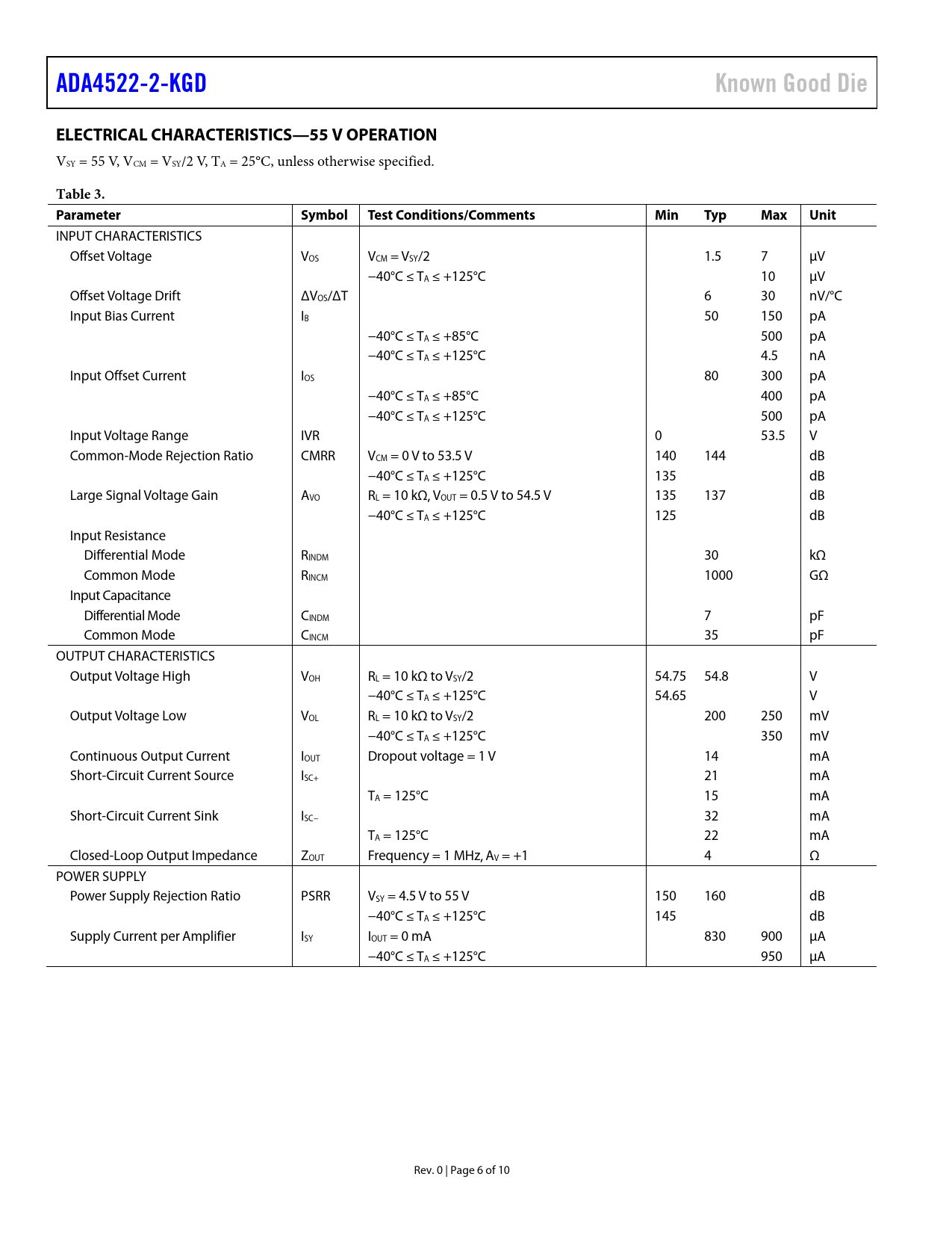 ADA4522-2-KGD Known Good Die ELECTRICAL CHARACTERISTICS—55 V OPERATION Table 3 Parameter Symbol Test Conditions/Comments Min