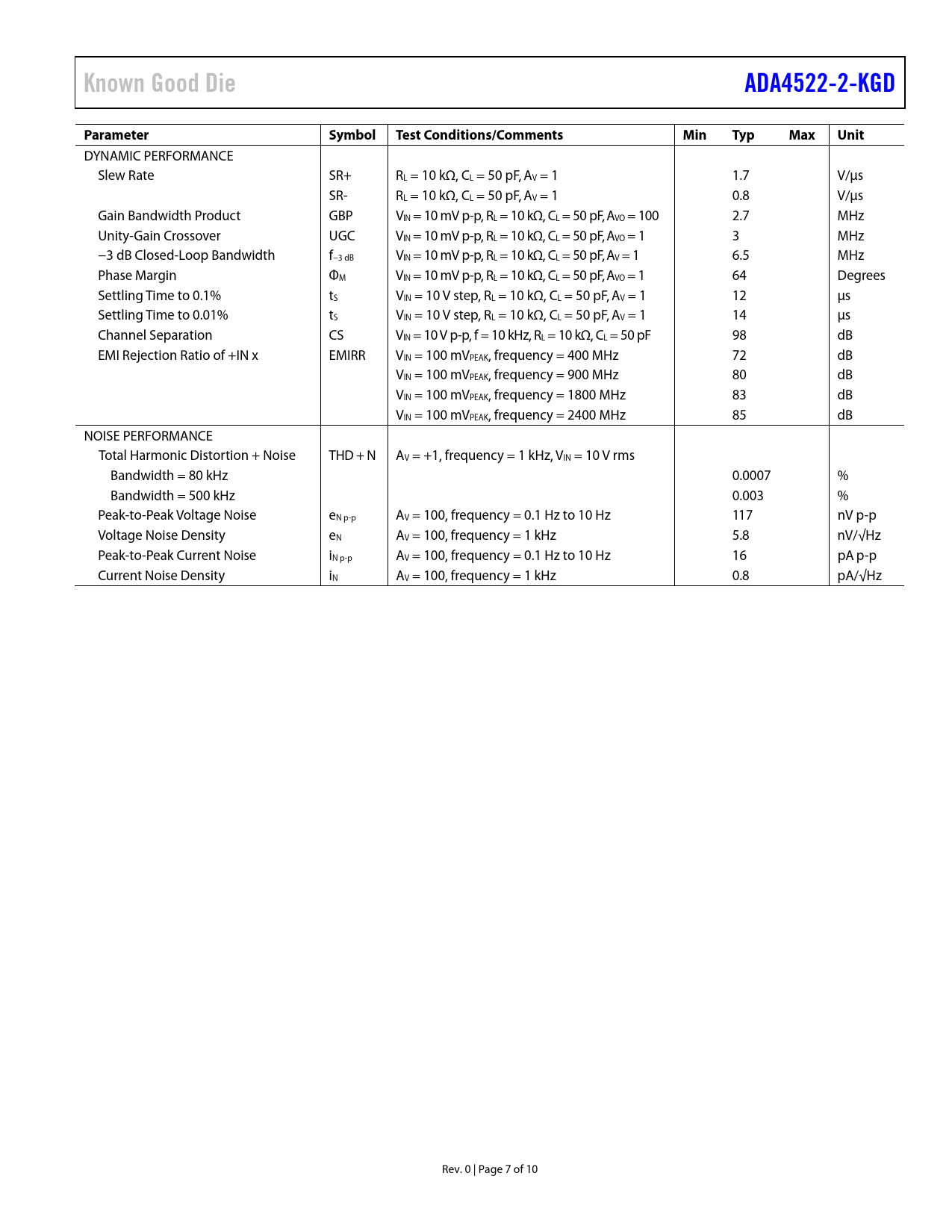 | Seiten / Seite | 10 / 7 — Known Good Die. ADA4522-2-KGD. Parameter Symbol. Test. … |