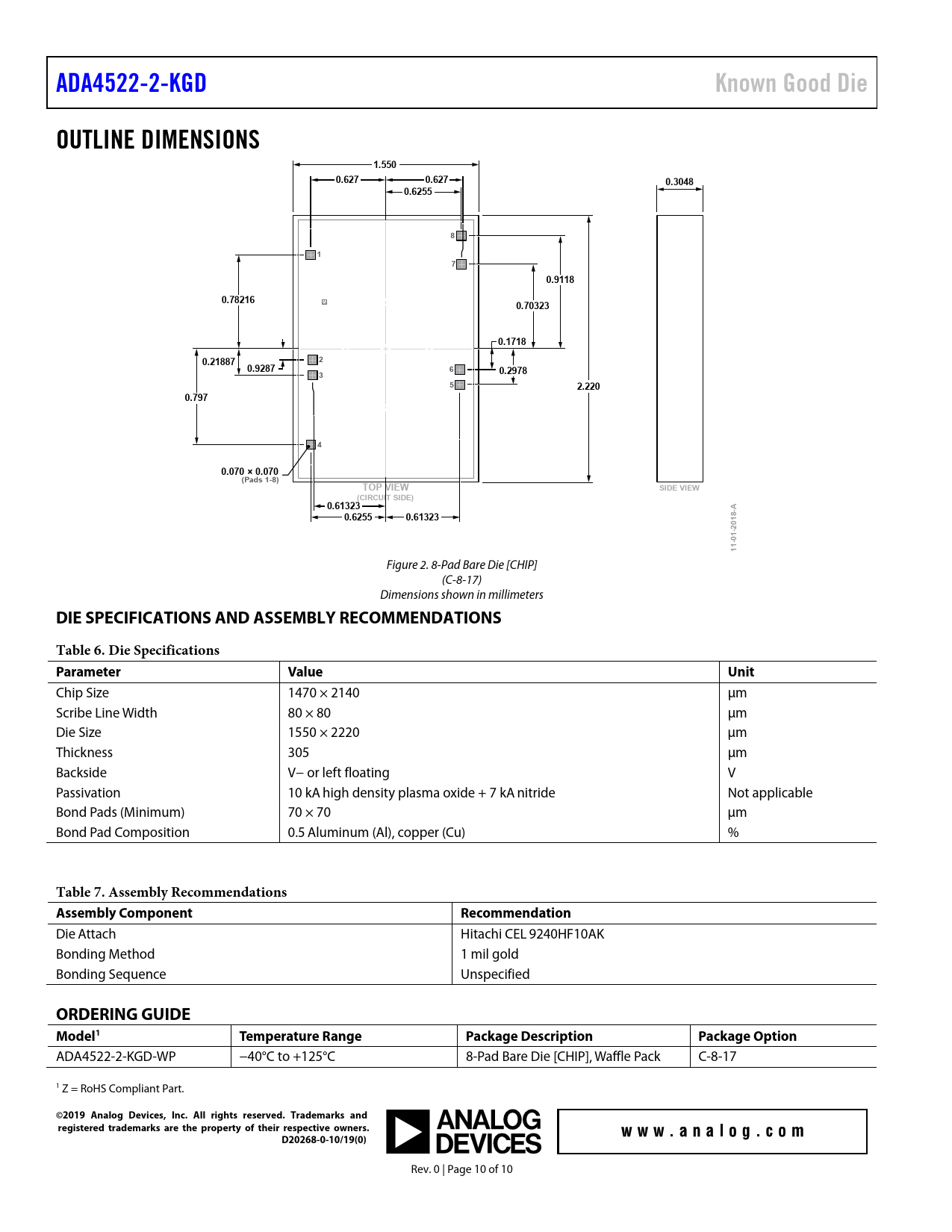 | Seiten / Seite | 10 / 10 — ADA4522-2-KGD. Known Good Die. OUTLINE DIMENSIONS. 1.550. 0.627. 0.3048. … |