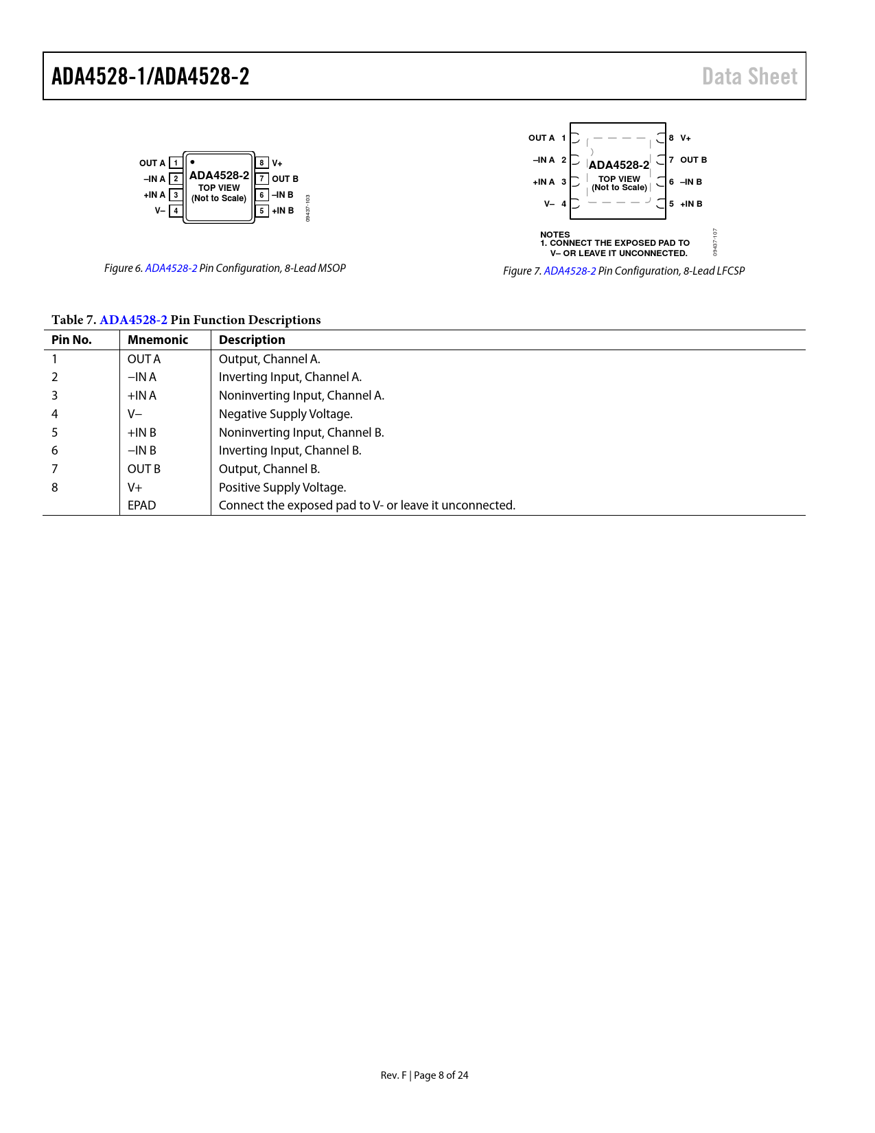 09 Figure 6. ADA4528-2 Pin Configuration, 8-Lead MSOP Figure 7. ADA4528-2 Pin Configuration, 8-Lead LFCSP