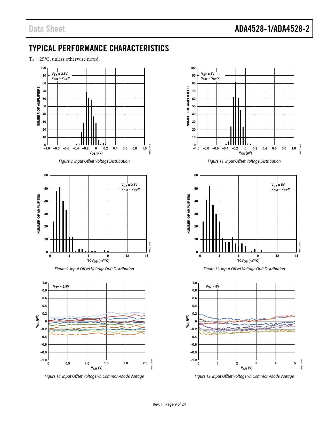 Data SheetADA4528-1/ADA4528-2TYPICAL PERFORMANCE CHARACTERISTICS TA = 25°C, unless otherwise noted. 100100VV90SY = 2.5V90SY = 5VVCM = VSY/2VCM = VSY/28080RS 70RS 70IEIEIFIFL 60LP60PAM 50AMF50FR O 40R O 40BEBE3030NUMNUM2020101000 002 005 –1.0–0.8–0.6–0.4–0.200.20.40.60.81.0–1.0–0.8–0.6–0.4–0.200.20.40.60.81.0VOS (µV) 09437- VOS (µV) 09437- Figure 8. Input Offset Voltage Distribution Figure 11. Input Offset Voltage Distribution 6060VSY = 2.5VVSY = 5V50V50CM = VSY/2VCM = VSY/2SSRR4040LIFIELIFIEPPMMAA30F30FR OR OBE20BE20NUMNUM1010 003 006 0 09437- 0 09437- 0369121503691215TCVOS (nV/°C)TCVOS (nV/°C) Figure 9. Input Offset Voltage Drift Distribution Figure 12. Input Offset Voltage Drift Distribution 1.01.0VSY = 2.5VVSY = 5V0.80.80.60.60.40.40.20.2V)V)(µ0(µ0OSOSVV–0.2–0.2–0.4–0.4–0.6–0.6–0.8–0.8–1.0–1.0 004 007 00.51.01.52.02.5012345VCM (V) 09437- VCM (V) 09437- Figure 10. Input Offset Voltage vs. Common-Mode Voltage Figure 13. Input Offset Voltage vs. Common-Mode Voltage Rev. F | Page 9 of 24 Document Outline FEATURES APPLICATIONS GENERAL DESCRIPTION PIN CONNECTION DIAGRAMS TABLE OF CONTENTS REVISION HISTORY SPECIFICATIONS ELECTRICAL CHARACTERISTICS—2.5 V OPERATION ELECTRICAL CHARACTERISTICS—5 V OPERATION ABSOLUTE MAXIMUM RATINGS THERMAL RESISTANCE ESD CAUTION PIN CONFIGURATIONS AND FUNCTION DESCRIPTIONS TYPICAL PERFORMANCE CHARACTERISTICS APPLICATIONS INFORMATION INPUT PROTECTION RAIL-TO-RAIL INPUT AND OUTPUT NOISE CONSIDERATIONS 1/f Noise Source Resistance Voltage Noise Density with Different Gain Configurations Residual Voltage Ripple COMPARATOR OPERATION PRINTED CIRCUIT BOARD LAYOUT OUTLINE DIMENSIONS ORDERING GUIDE