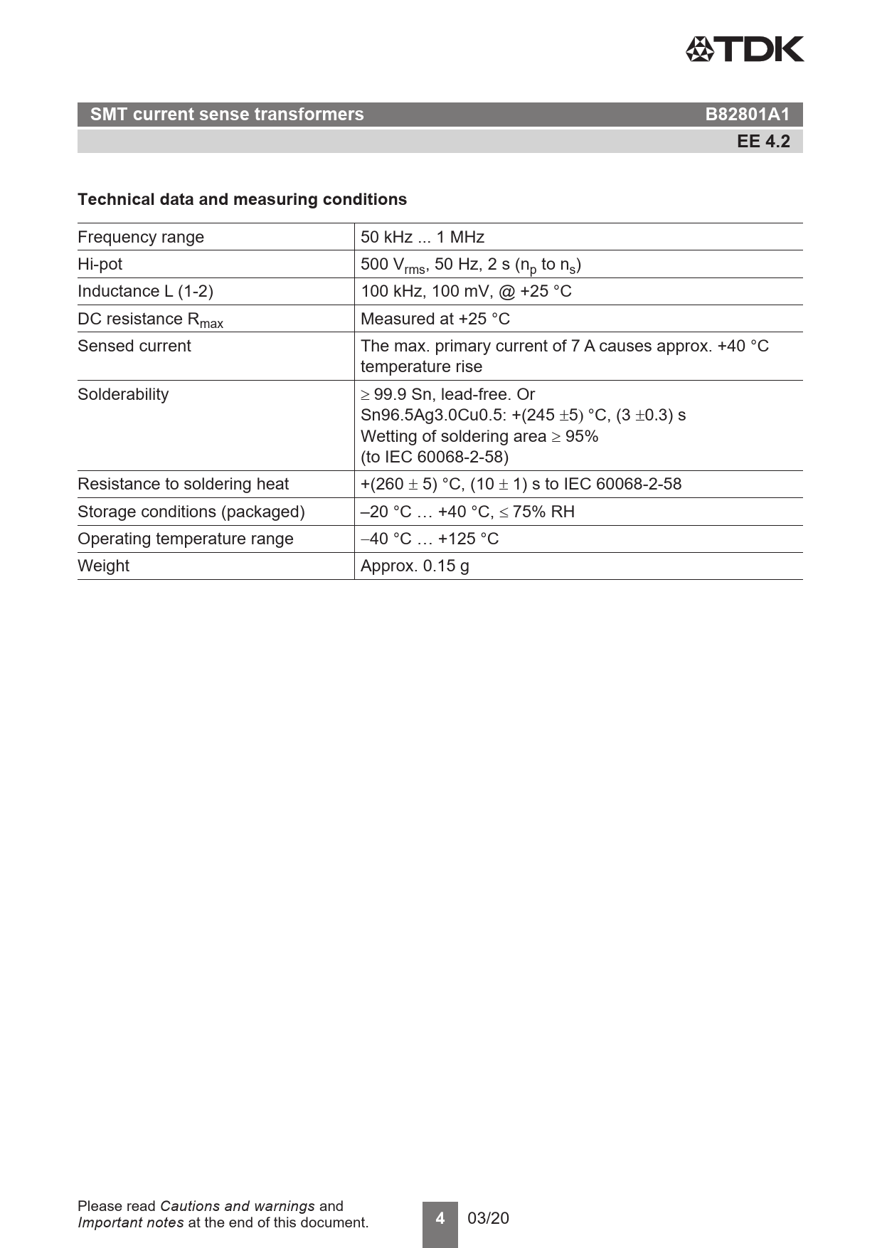 SMT current sense transformers B82801A1 EE 4.2 Technical data and measuring conditions